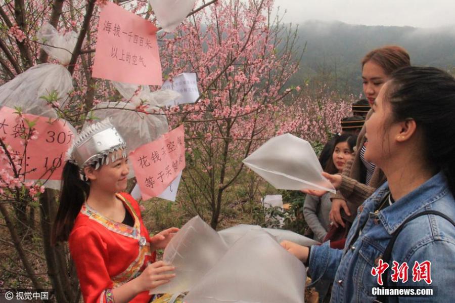 Local ethnic vendors sell bagged clean air to visitors at the scenic Lianshan Mountain in Qingyuan, south China's Guangdong Province, on March 19, 2016. Many places in southern China's Guangdong Province have been blanketed by heavy smog in the past week. This has led many city residents to visit the Lianshan Mountain, where 85 percent of the land is covered by forests. Local villagers of the Zhuang and Yao ethnic groups, who often sell homegrown specialties at the scenic mountain area, have come up with the idea of selling bagged clean air to visitors. The price of a large bag of air is 30 yuan (about $4.6), while a smaller bag goes for 10 yuan. (Photo/CFP)