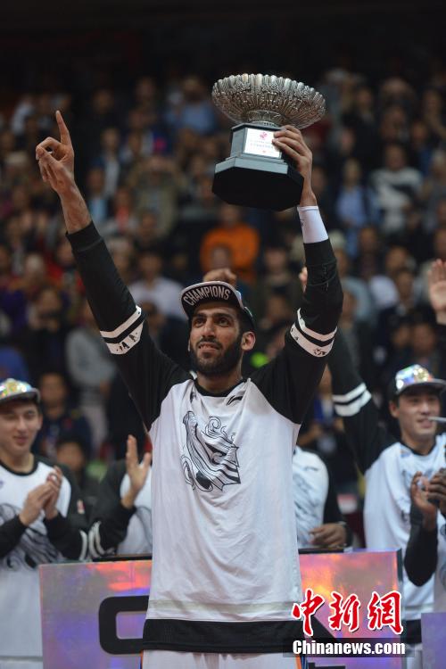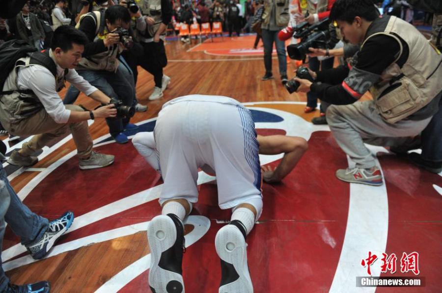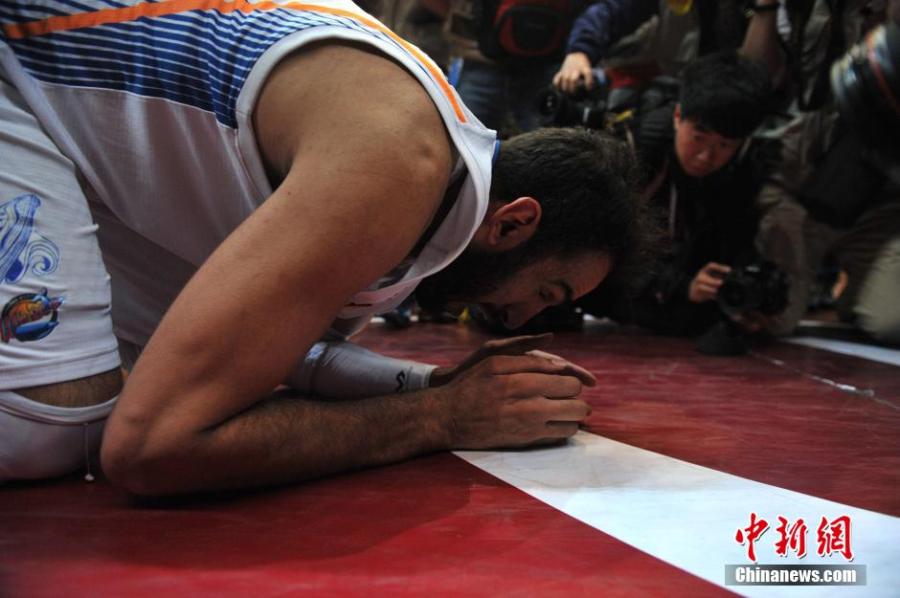 Hamed Haddadi of the Sichuan Blue Whales kisses the basketball court after a victory over Liaoning in Chengdu City, the capital of Southwest China’s Sichuan Province, March 20, 2016. Sichuan beat Liaoning 94-91 in Game 5 of the 2015-2016 CBA Finals in Chengdu on Sunday and won the series 4-1 to become the fifth champions in CBA's 21-year history. (Photo: China News Service/Zhang Lang)