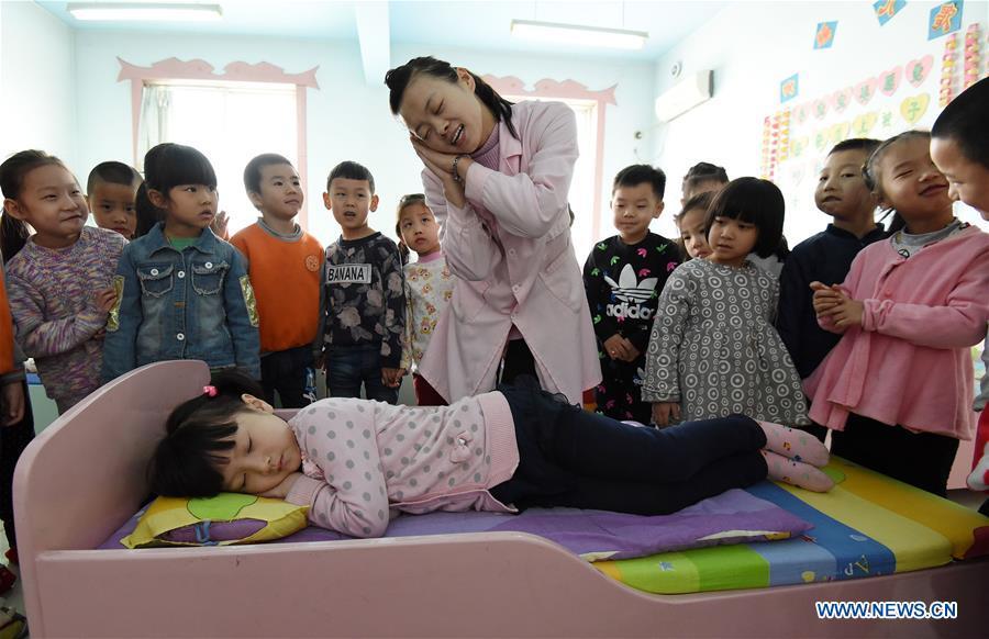 A teacher gives instructions of healthy sleeping body position on the World Sleep Day at a kindergarten in Kaifeng, central China's Henan Province, March 21, 2016.(Photo: Xinhua/Li Junsheng)