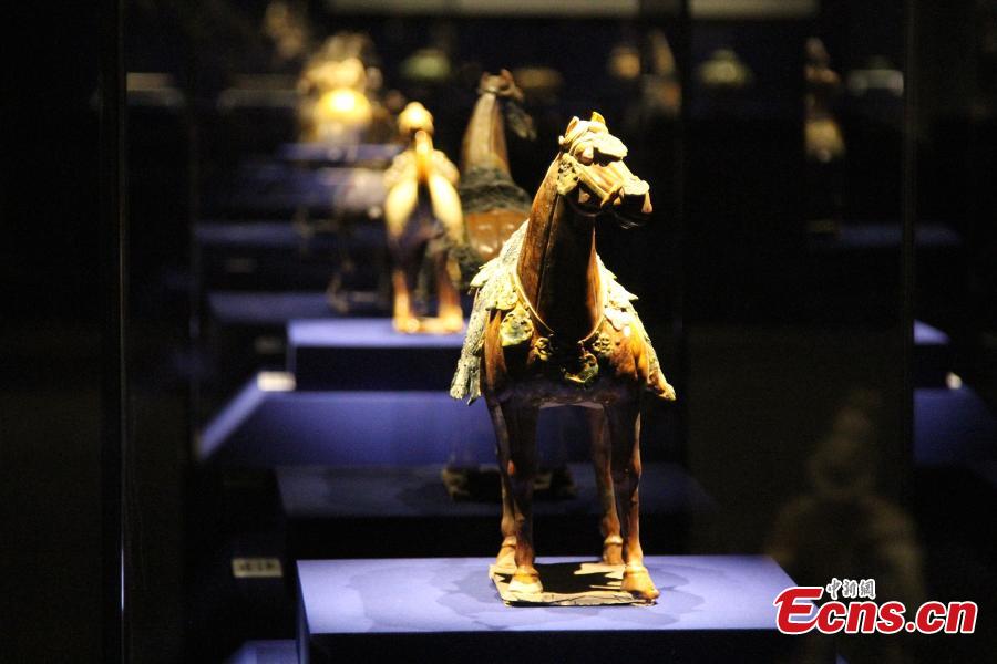 An exhibition of tri-colored glazed pottery works of the Tang Dynasty (618-907) is held at the Shaanxi History Museum in Xi’an City, the capital of Northwest China’s Shaanxi Province, March 22, 2016. About 130 tri-colored glazed pottery works selected from the dynasty’s two capitals, Chang’an (present-day Xi’an) and Luoyang in Henan Province, were displayed in the exhibition. (Photo: China News Service/Tian Jin)