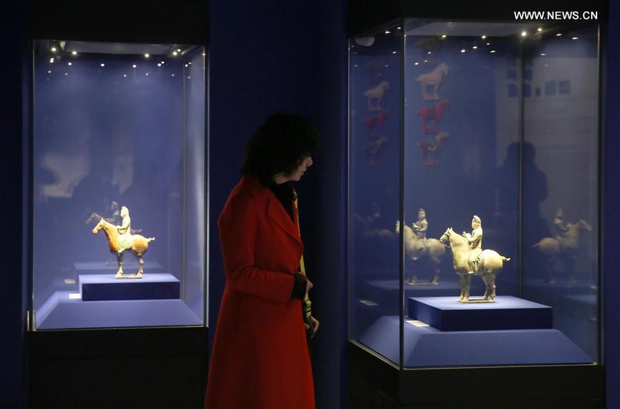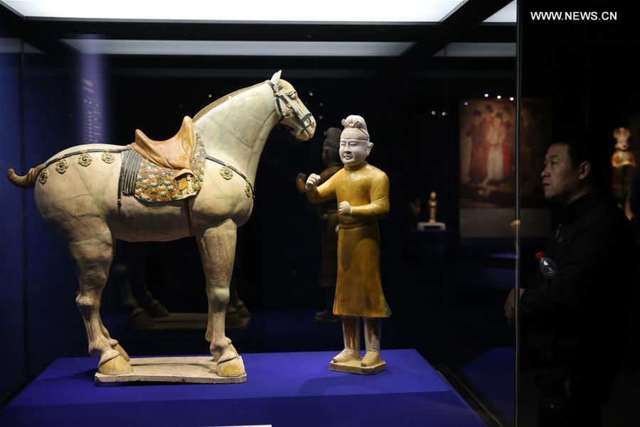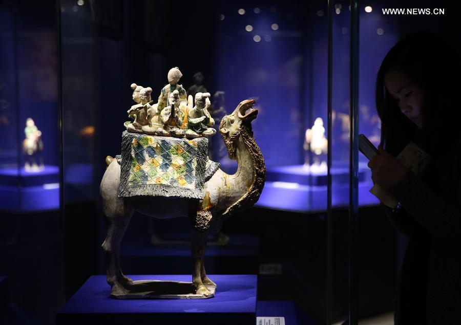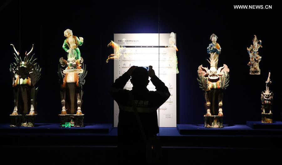 A visitor looks at a tri-colored glazed pottery work is seen displayed at an exhibition in Shaanxi History Museum in Xi'an, capital of northwest China's Shaanxi Province, March 23, 2016. 130 pieces of tri-colored glazed pottery art works were exhibited free here to public for the next three months. (Xinhua/Shao Rui)