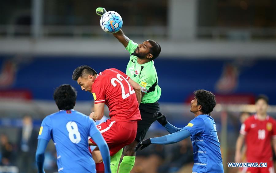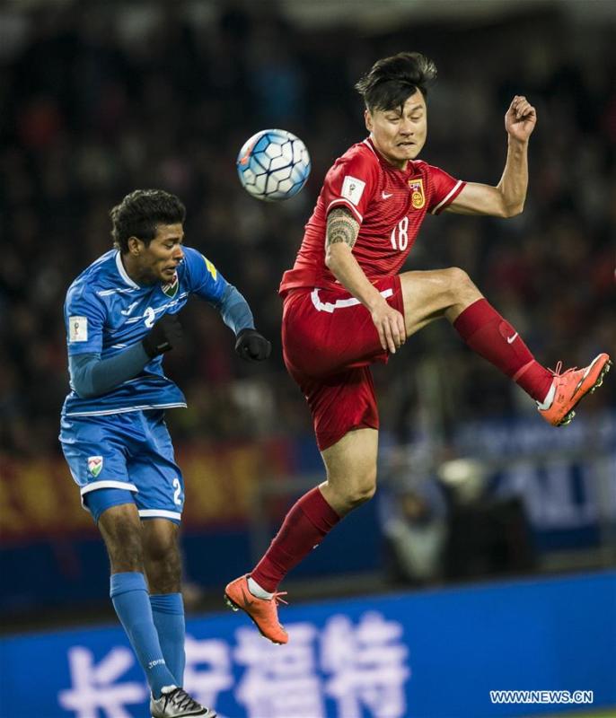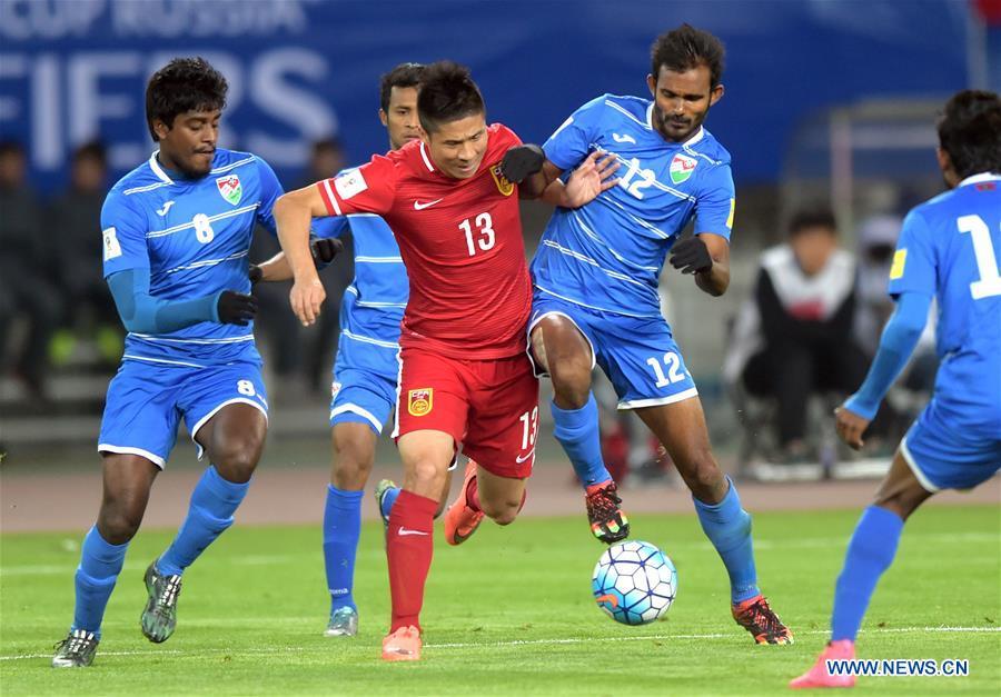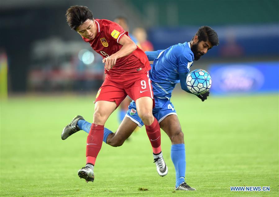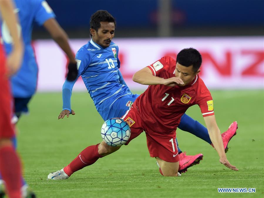 Gao Lin (R) of China vies with Ali Samooh of Maldives during the 2018 FIFA World Cup qualification football match in Wuhan, central China's Hubei Province, March 24, 2016. (Photo: Xinhua/Xiao Yijiu)
