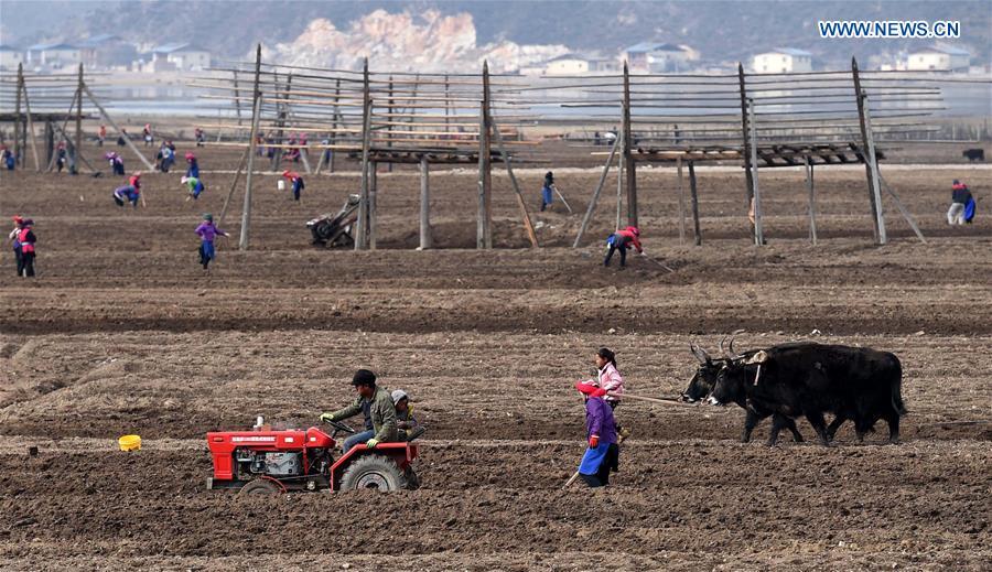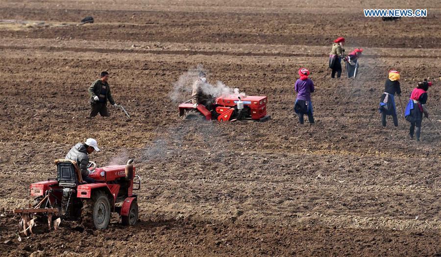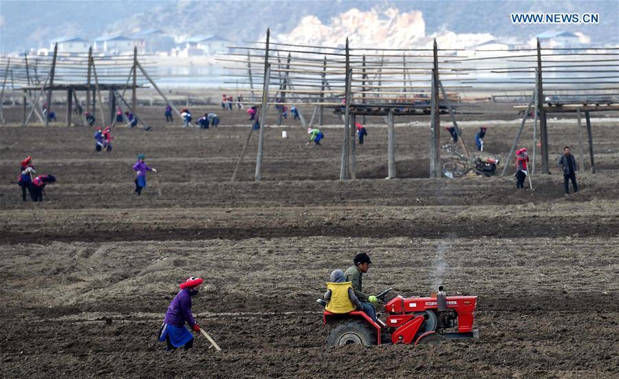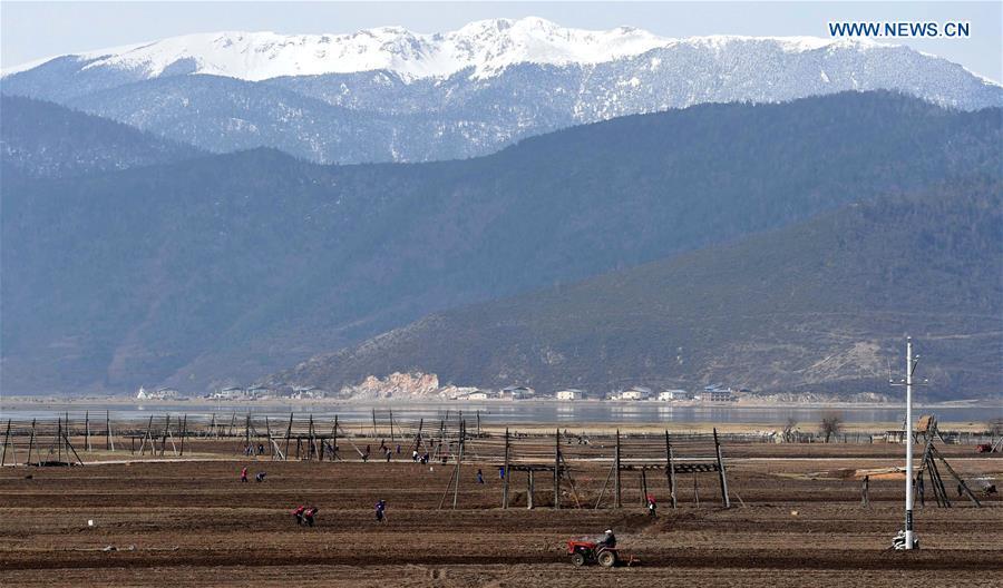 Villagers of Tibetan ethnic group plough the field at an altitude of more than 3,300 meters in Jiefang Village, Jiantang Township, Shangri-La County, southwest China's Yunnan Province, March 24, 2016. (Photo: Xinhua/Lin Yiguang)