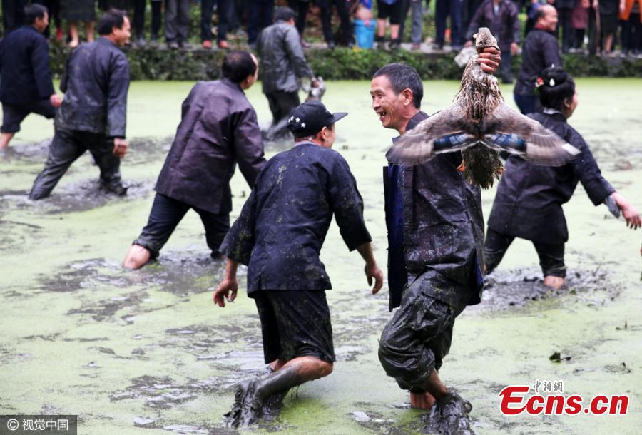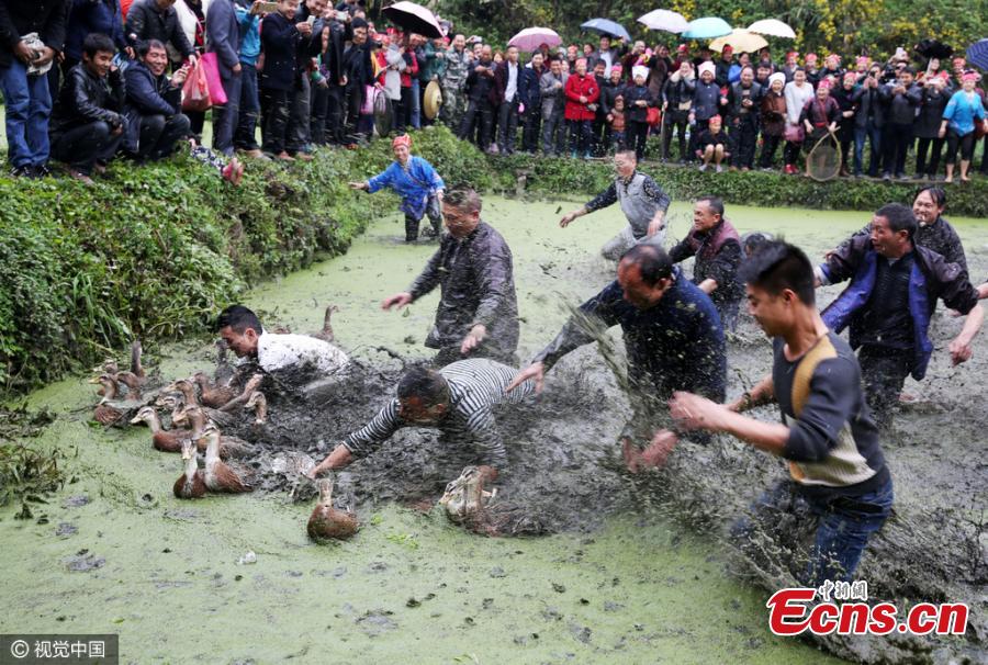 Farmers catch ducks during a traditional folk festival in Qiandongnan Miao and Dong Autonomous Prefecture in Southwest China’s Guizhou Province, March 24, 2016. (Photo/CFP)