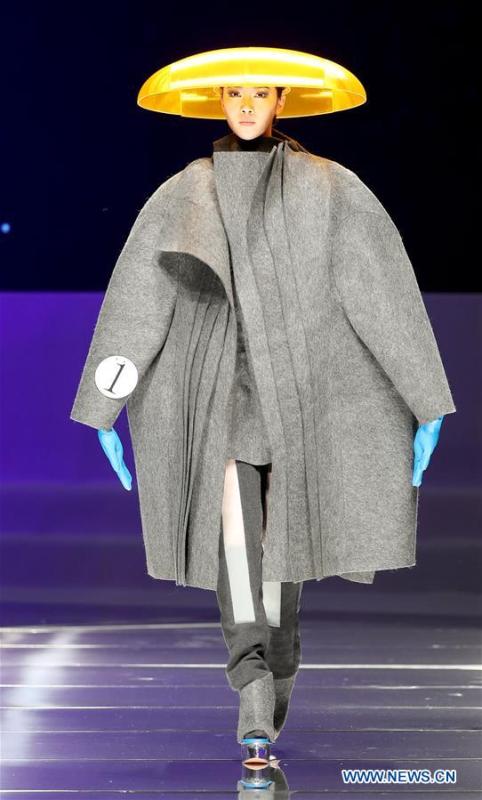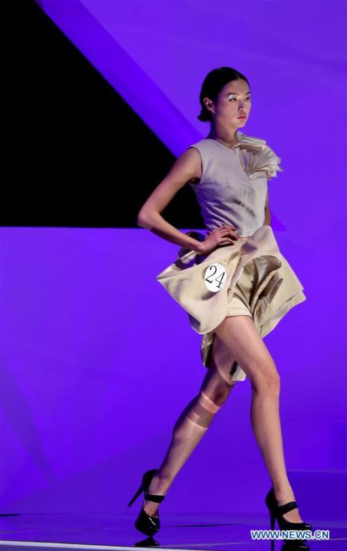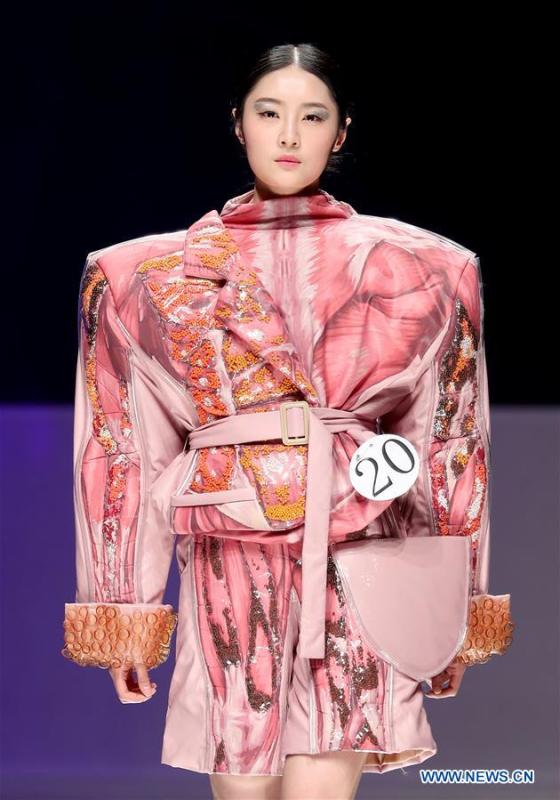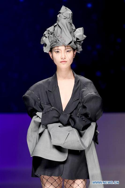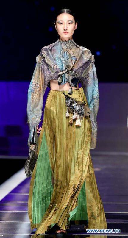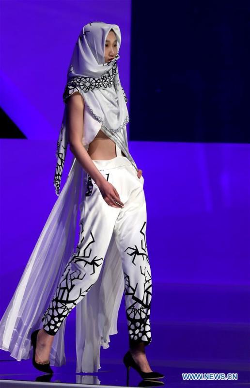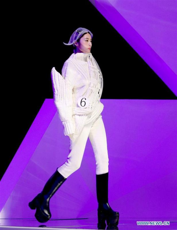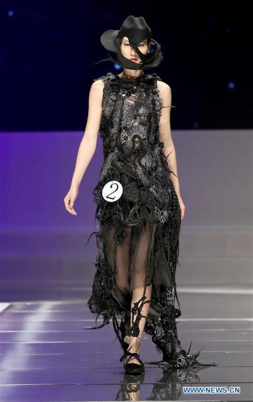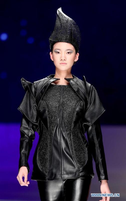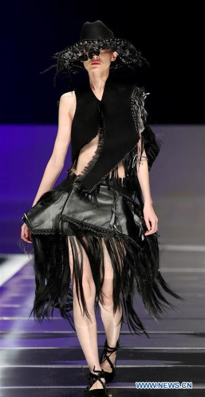 A model presents a creation of the 24th China International Young Fashion Designers Contest during the China Fashion Week in Beijing, capital of China, March 25, 2016. (Xinhua/Chen Jianli)