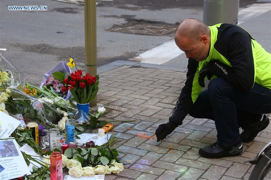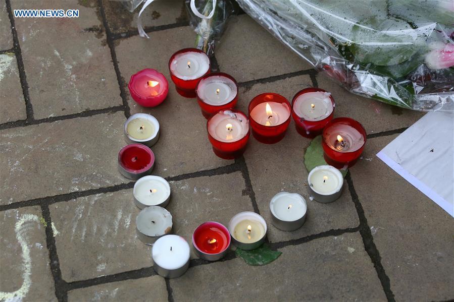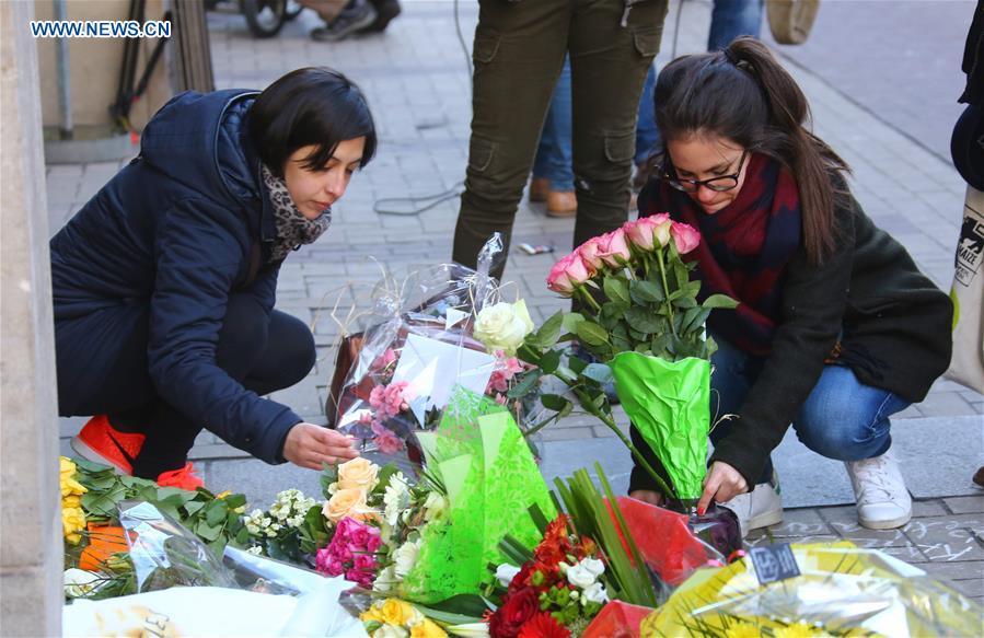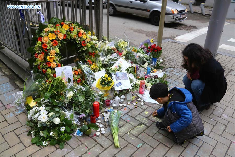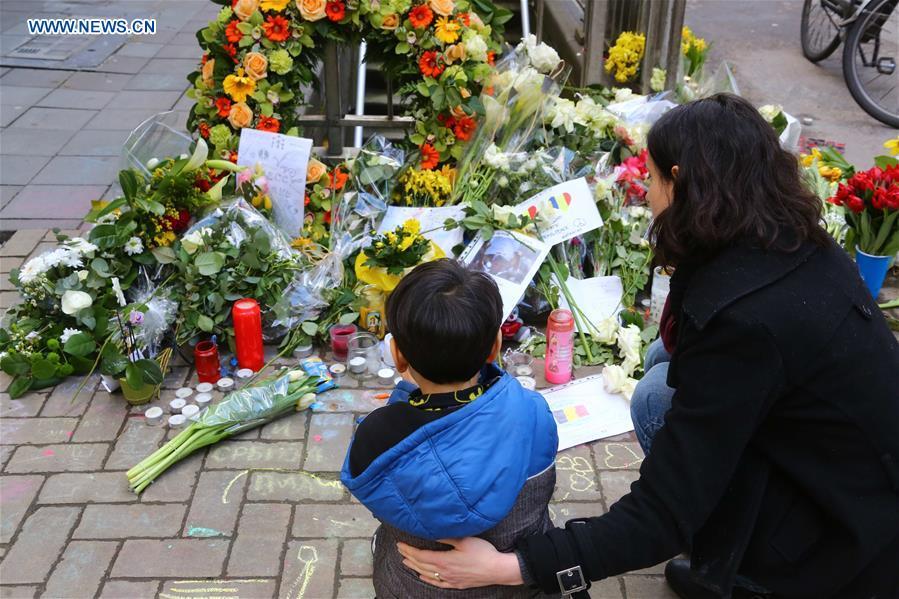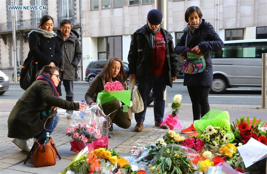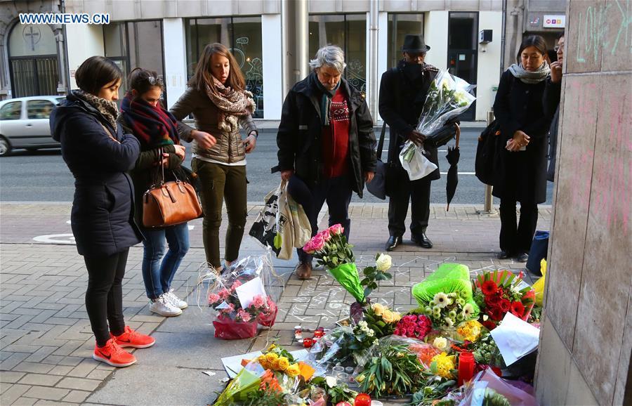 People lay flowers to mourn the victims at Maelbeek metro station in Brussels, Belgium, March 25, 2016. Two suicide blasts hit the departures hall of Brussels International Airport and a subway carriage at the Maelbeek station, close to the European Union institutions on Tuesday, killing at least 31 people and injuring over 300 others.(Xinhua/Gong Bing)