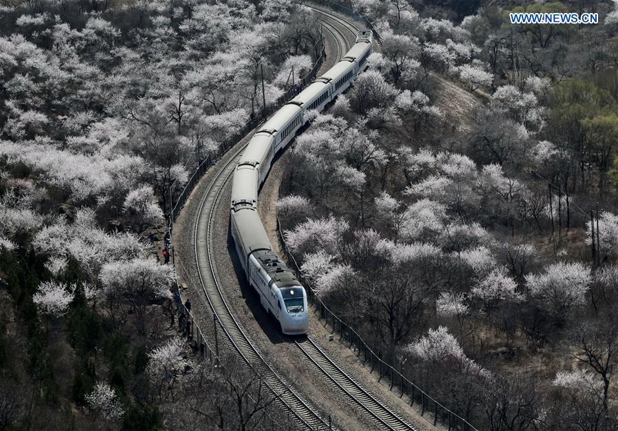 A train runs in a mountainous area where flowers are in full bloom near Juyongguan Pass of the Great Wall in Beijing, capital of China, March 25, 2016. (Photo: Xinhua/Wang Xibao)