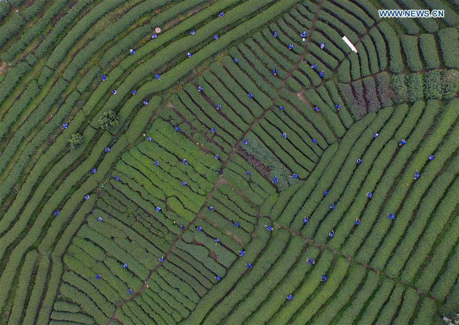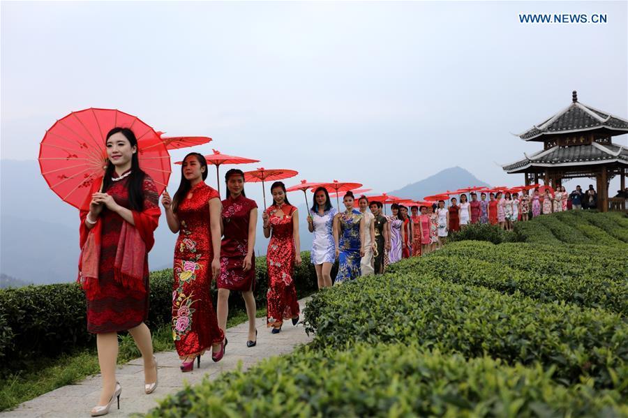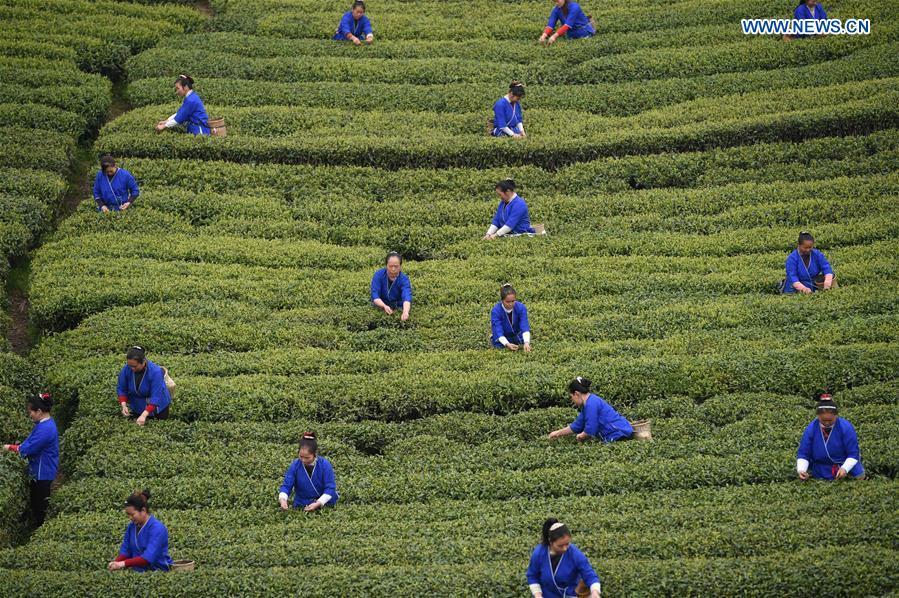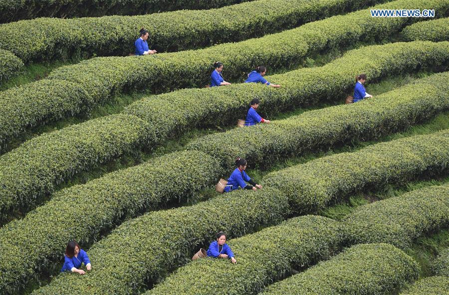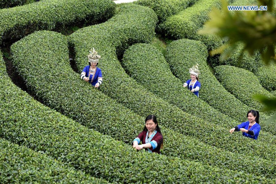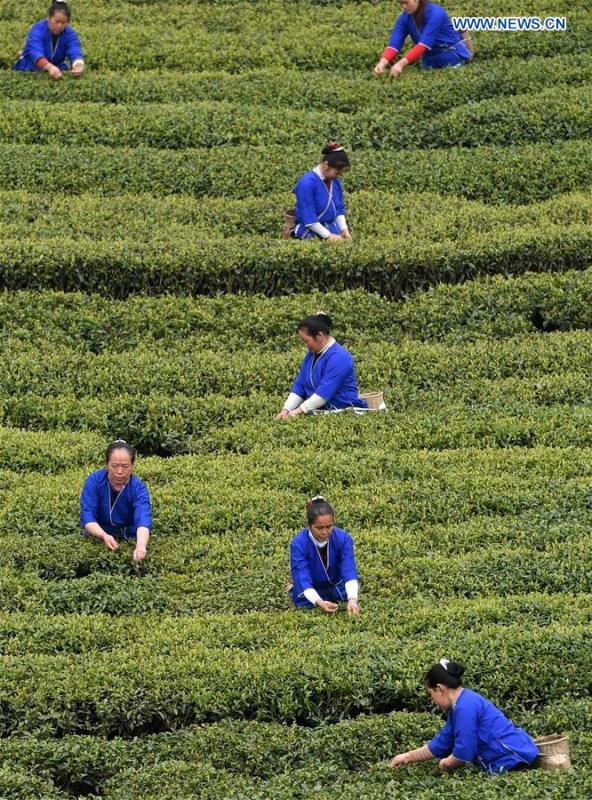 Women of Dong ethnic group take part in a tea leaves picking contest in Buyang Village of Bajiang Township in Sanjiang Dong Autonomous County, south China's Guangxi Zhuang Autonomous Region, March 26, 2016. Sanjiang Dong Autonomous County has 165,000 mu (11,000 hectares) of tea planting area. (Photo: Xinhua/Huang Xiaobang)