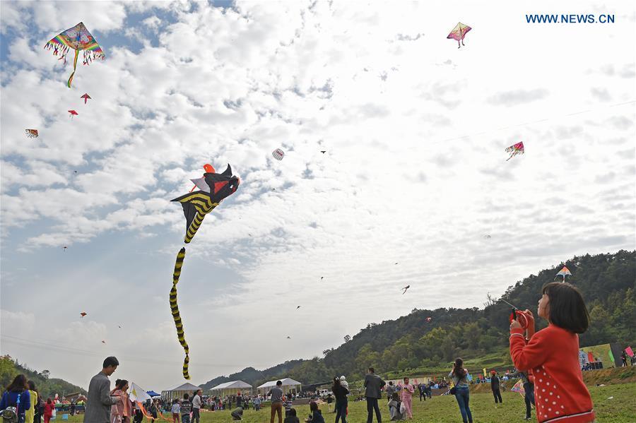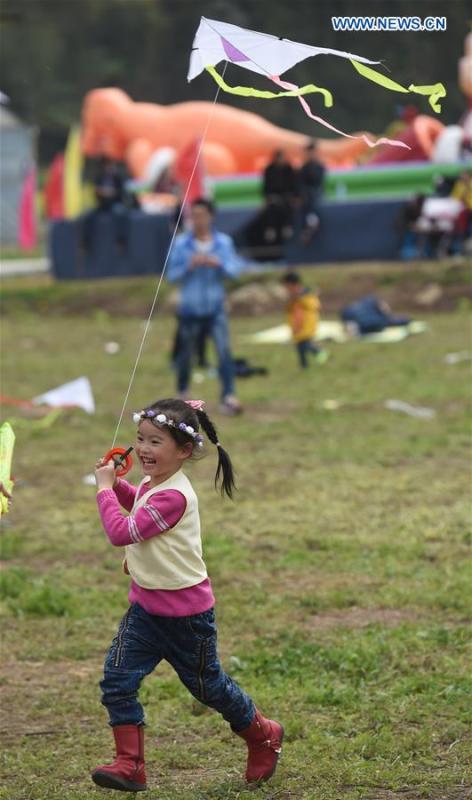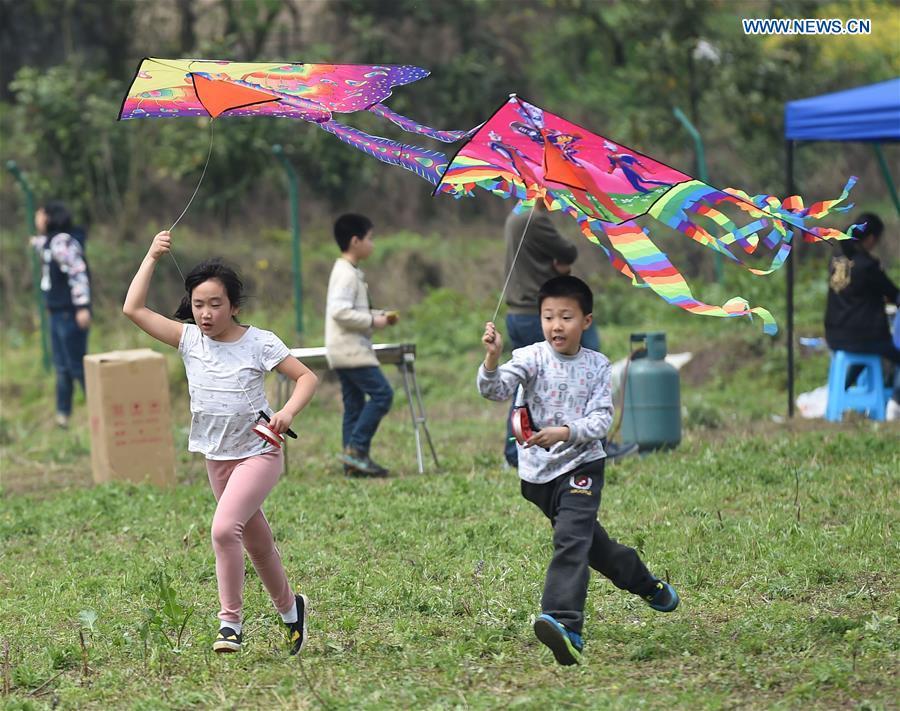 People fly kites in Zhongliang township of southwest China's Chongqing Municipality, March 26, 2016. A kite festival was held in Zhongliang township on Saturday with countryside snack and music, which attracted nearby citizens to feel the joy of flying kites. (Photo: Xinhua/Chen Cheng)