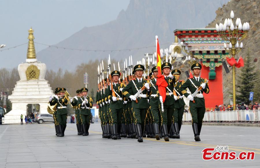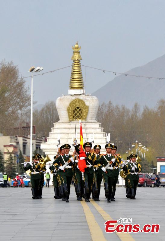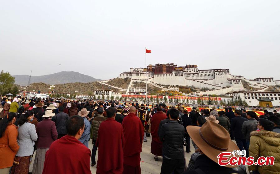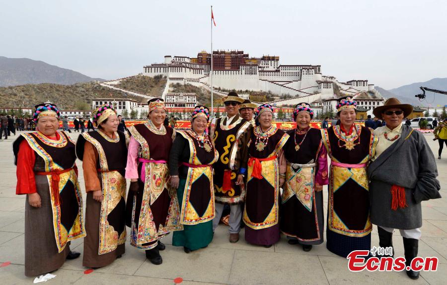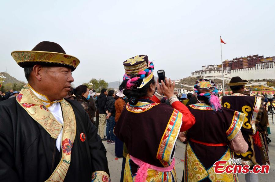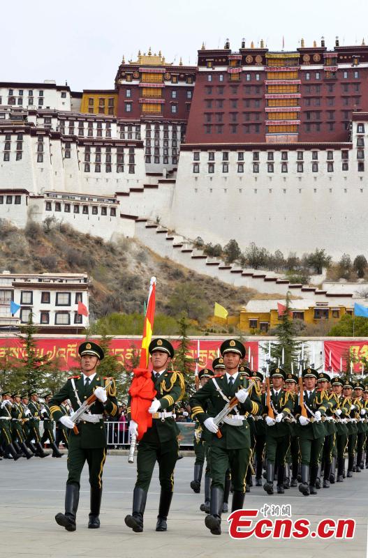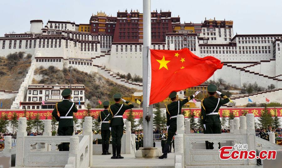 A ceremony is held to mark the 57th anniversary of the emancipation of Tibetan serfs in front of the Potala Palace in Lhasa, the capital of Southwest China’s Tibet Autonomous Region, March 28, 2016. More than 3,000 people from all walks of life attended the ceremony to commemorate the 1959 democratic reform in Tibet, which ended feudal serfdom and freed about 1 million Tibetan serfs. (Photo: China News Service/Li Lin)