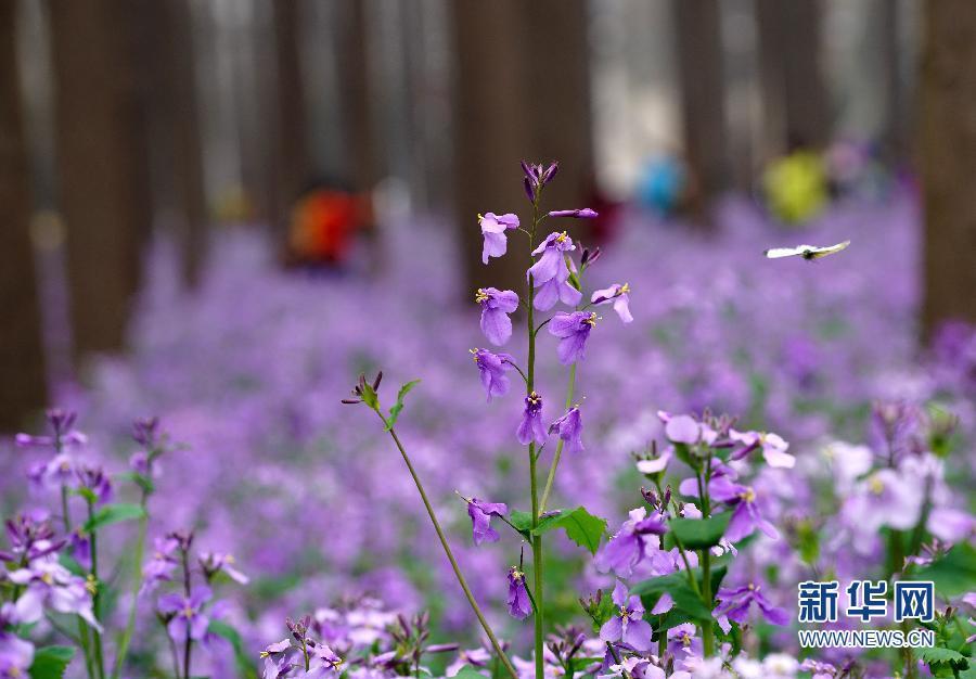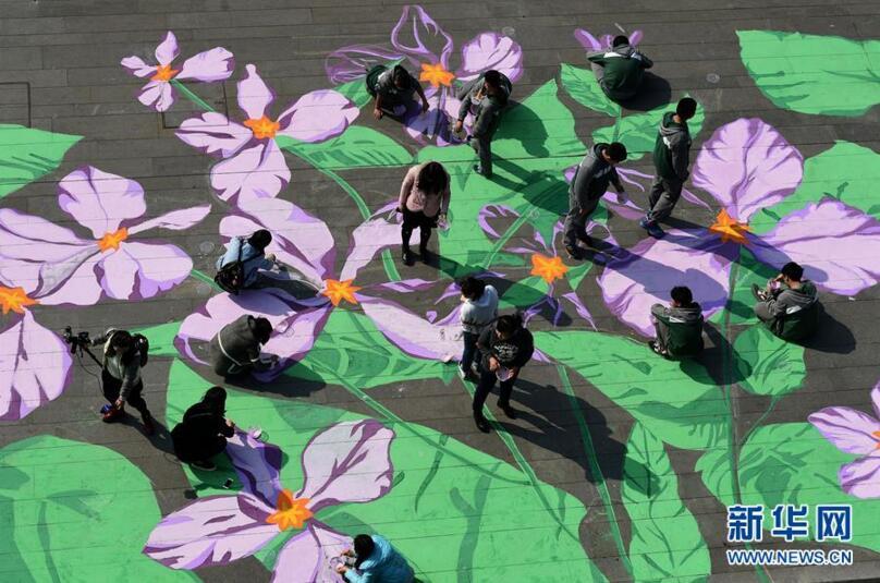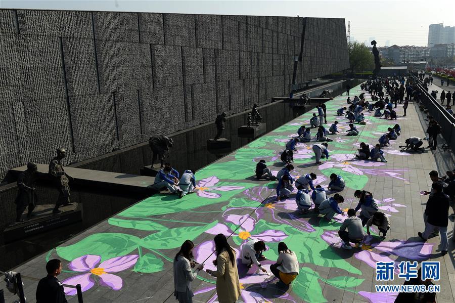 Painters from Nanjing University of the Arts and nearly 200 volunteers have created 2500 square meters violet orychophragmus graffiti on the ground outside Nanjing Massacre Memorial Hall in Nanjing, capital of China’s eastern Jiangsu province on March 28, 2016. (Photo/Xinhua)