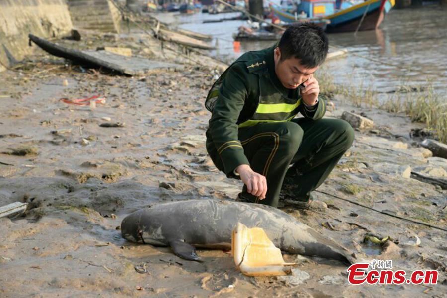 A grey finless porpoise that washed ashore is found dead with blood coming from its eyes at a Quanzhou wharf in East China’s Fujian Province, March 28, 2016. (Photo: China News Service/Guo Yu)