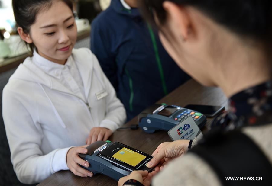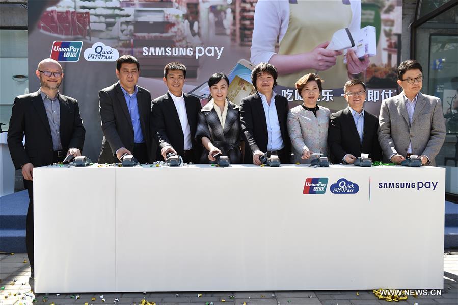 An user experiences Samsung Pay during an activity in the 798 Art Zone of Beijing, capital of China, March 29, 2016. Samsung Electronics' mobile payment service Samsung Pay was launched in China on Tuesday in partnership with China UnionPay. It is currently available on Samsung Galaxy S7, Galaxy S7 edge, Galaxy S6 edge-plus and Galaxy Note5 in China. (Photo: Xinhua/Li Xin)