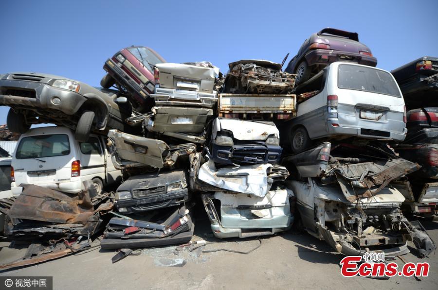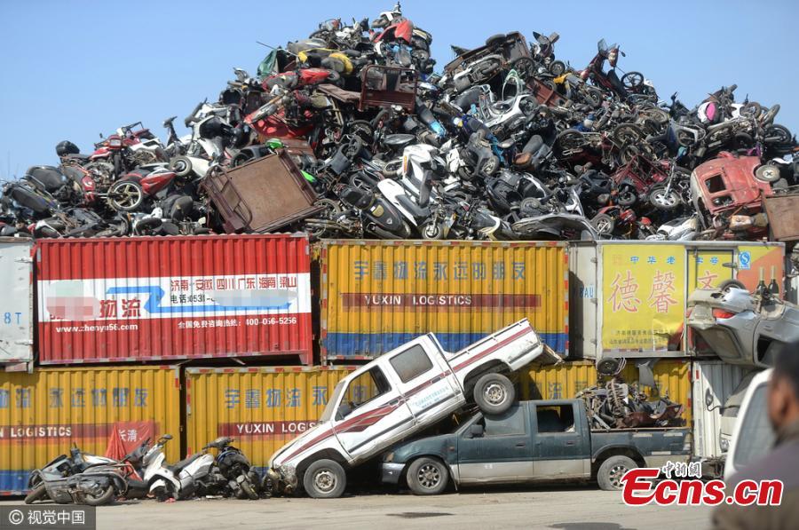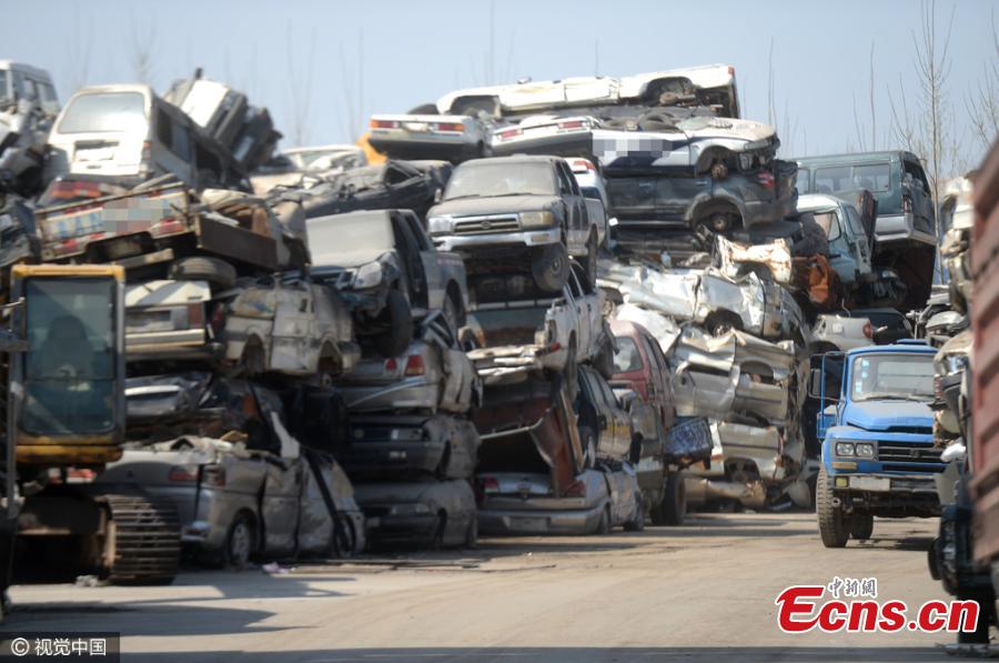 Scrap vehicles pile up at a collection center in Jinan City, the capital of East China’s Shandong Province, March 28, 2016. The plummeting price of recycled steel in recent years has discouraged the disassembling of old cars, a process that costs more than 1,000 yuan ($153), while the gaining is about 800 yuan. (Photo/CFP)