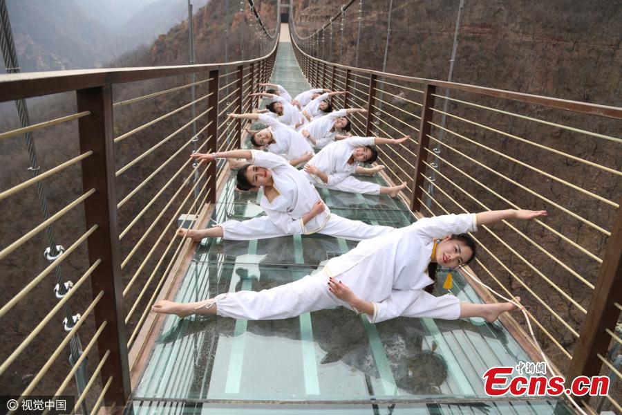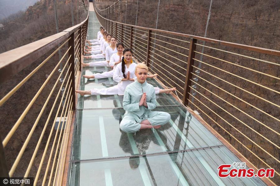 More than ten yoga lovers from both China and abroad challenge themselves to practice yoga on a glass skywalk on Fuxi Mountain with a height of 180 meters above sea level in central China's Henan Province on Wednesday, March 30, 2016. The skywalk with the length of 210 meters, is the first of its kind built in central China. (Photo/CFP)