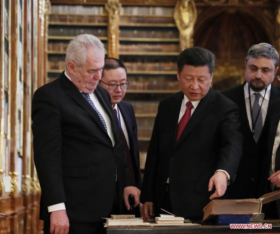 Chinese President Xi Jinping (R, front) and his Czech counterpart Milos Zeman (L, front) visit the Strahov Library in Prague, the Czech Republic, March 30, 2016. (Photo: Xinhua/Lan Hongguang)