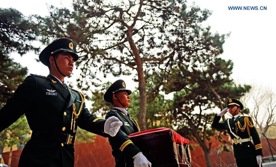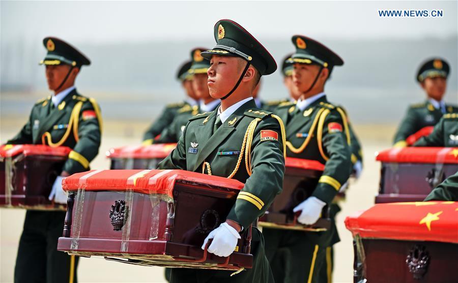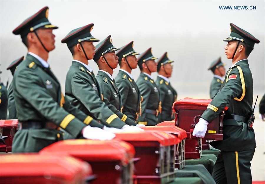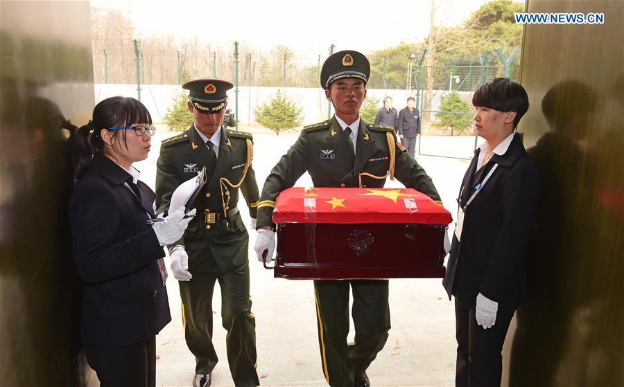 Soldiers of the Chinese People's Liberation Army escort coffins containing remains of soldiers of the Chinese People's Volunteers (CPV) killed in the Korean War, at a martyr cemetery in Shenyang, northeast China's Liaoning Province, March 31, 2016. The remains of 36 Chinese soldiers killed in the 1950-53 Korean War were returned to China on Thursday from the Republic of Korea (ROK), the third batch returned following a handover agreement signed by the two countries in 2013. Remains of a total number of 505 soldiers were returned to China in 2014 and 2015. (Xinhua/Yang Qing)