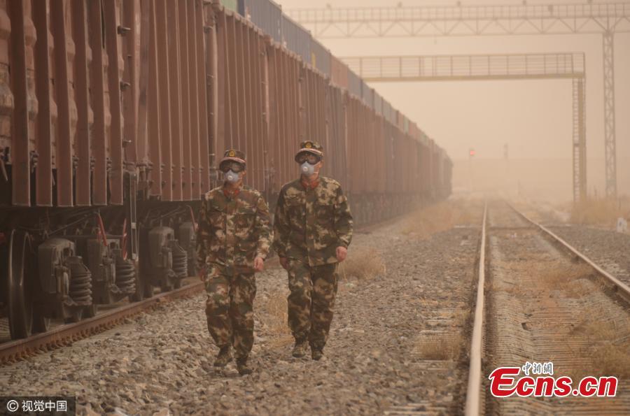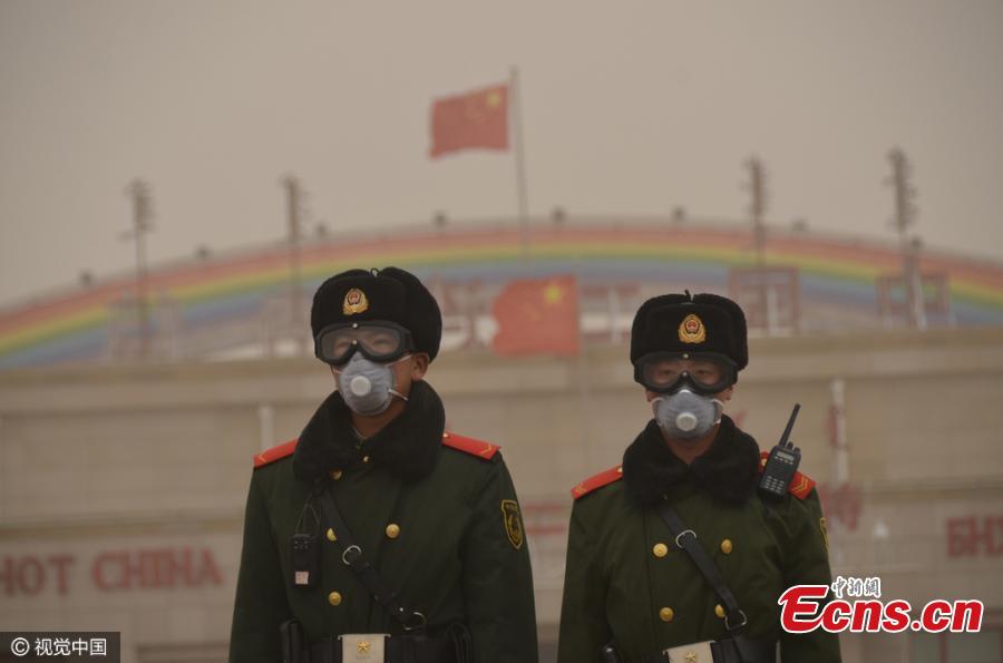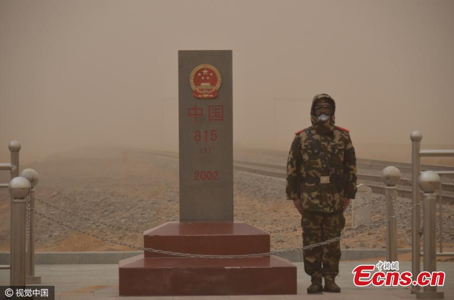 Frontier soldiers stand guard even though the heavy sandstorm spreads in air in border of China and Mongolia on March 31, 2016 in Xilingol League, north China's Inner Mongolia Autonomous Region. Sandstorms struck the region with a visibility less than 300 meters. (Photo/CFP)