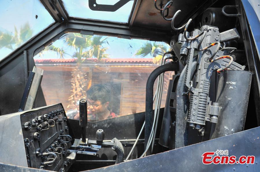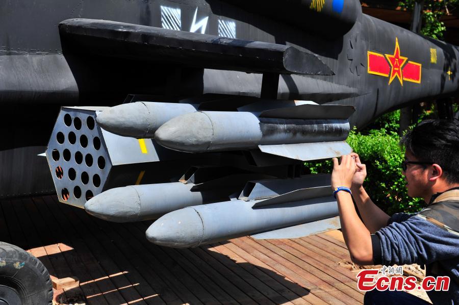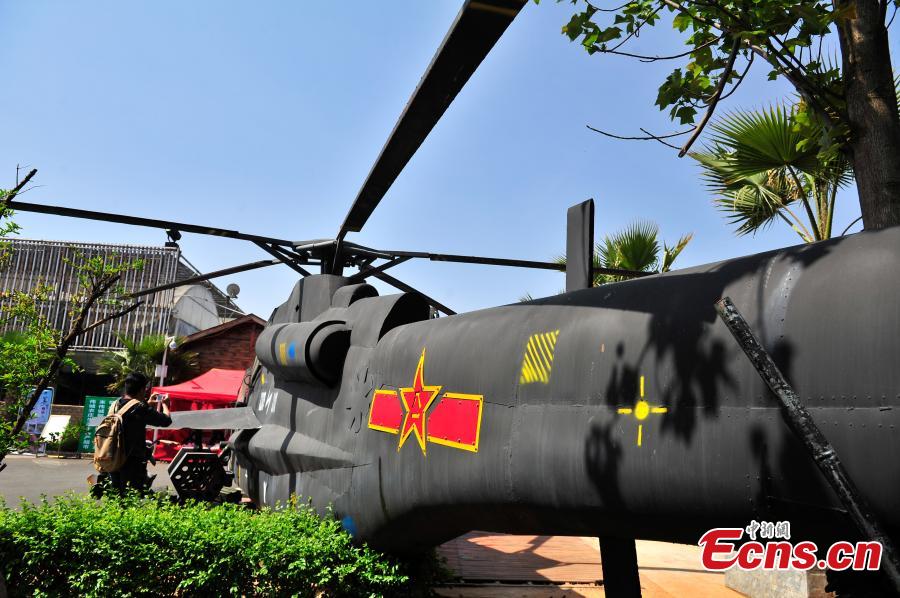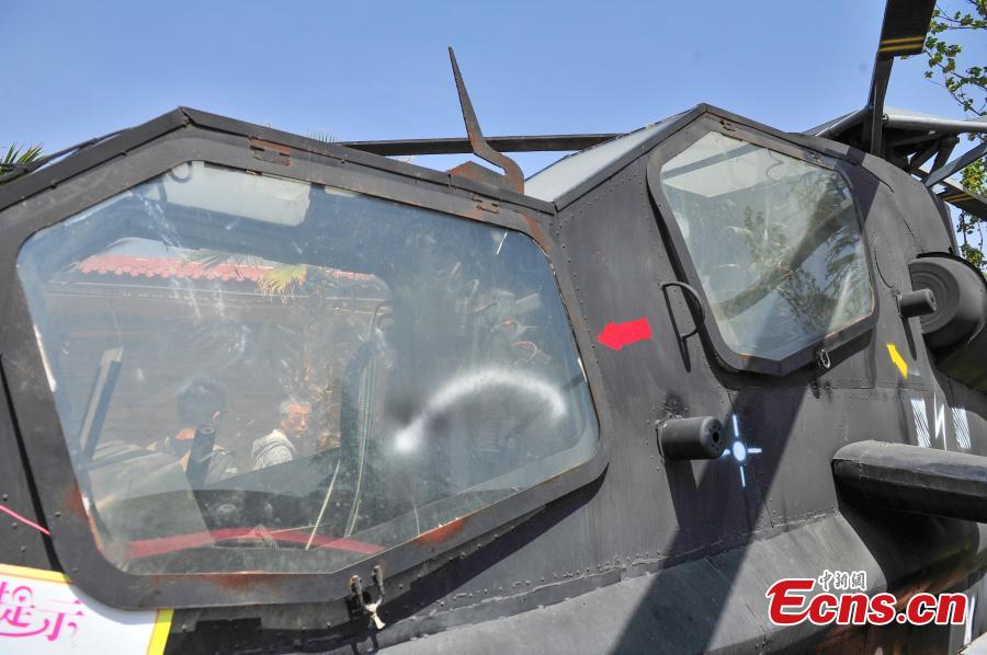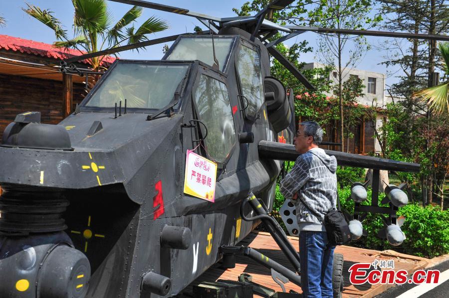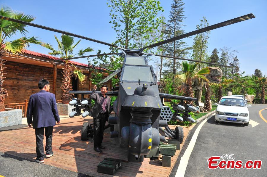 A helicopter model is installed in a restaurant in Kunming City, the capital of Southwest China’s Yunnan Province, March 31, 2016. It took 100,000 yuan ($15,300) to build the life-size military helicopter model using scrap parts. (Photo: China News Service/Liu Ranyang)