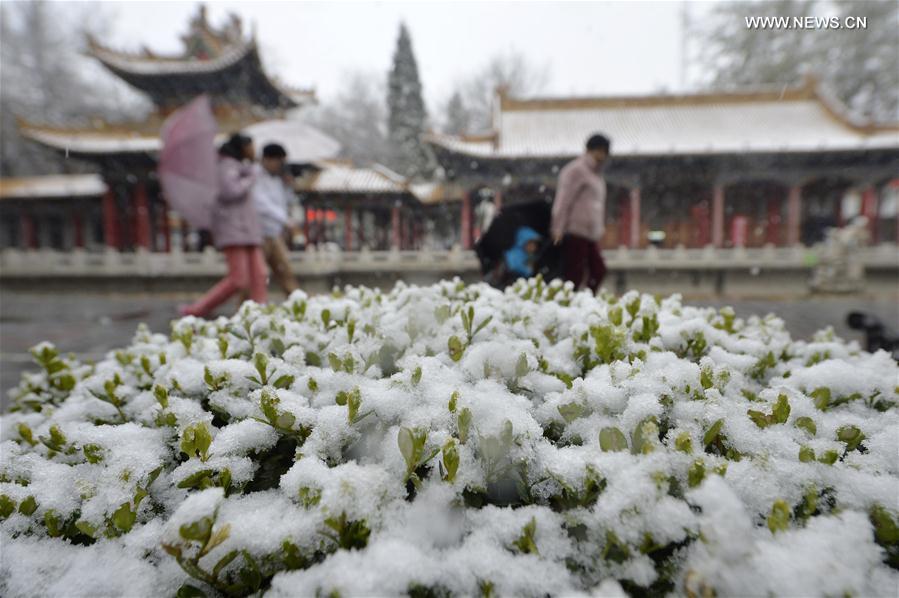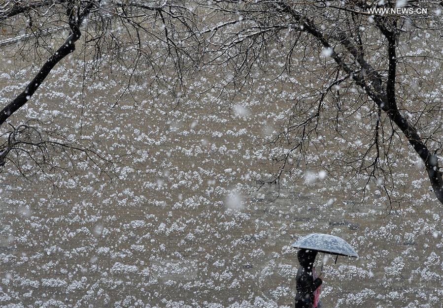 Pedestrians walk in snow in Yinchuan, capital of northwest China's Ningxia Hui Autonomous Region, April 2, 2016. Snowfall hit the city on Saturday, causing inconvenience for local residents. (Photo: Xinhua/Wang Peng)