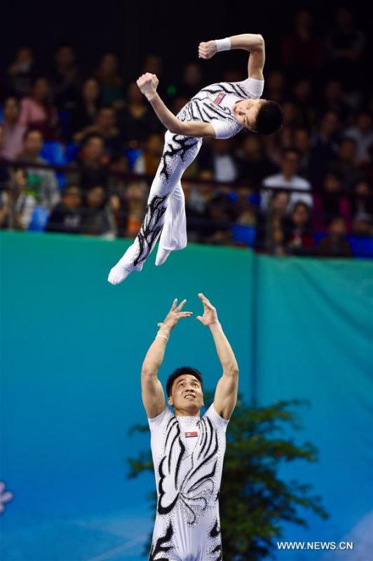 Kim Un Hak (R) and Ri Chol Jun of the Democratic People's Republic of Korea (DPRK) competes during the Men's Doubles final of the 25th Acrobatic Gymnastics World Championships in Putian, southeast China's Fujian Province, on April 2, 2016. Kim and Ri won the third place with 27.770 points. (Photo: Xinhua/Jiang Kehong)