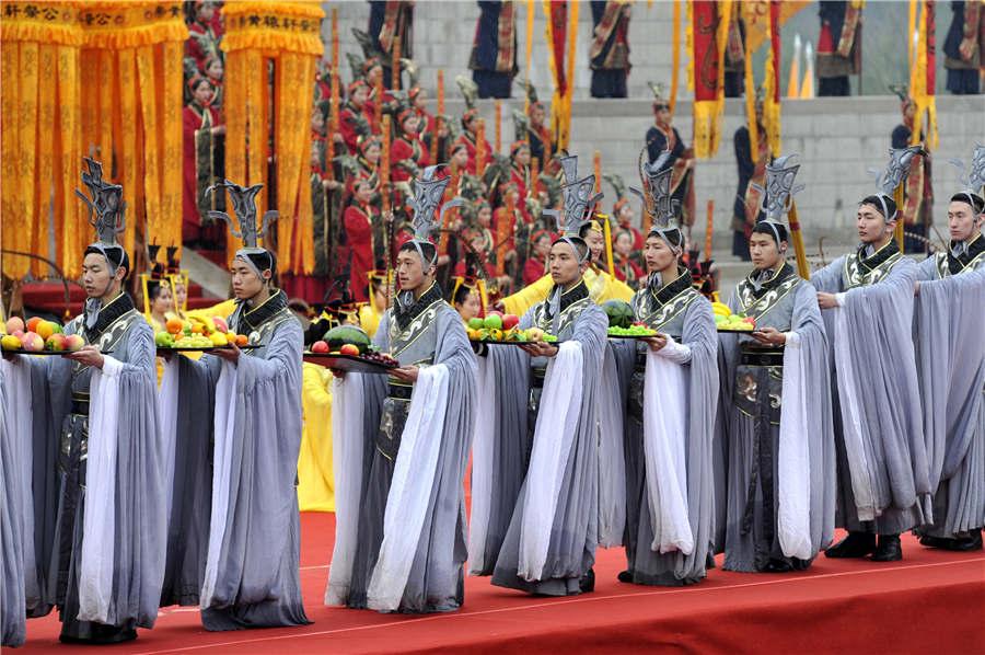 Actresses perform at a ceremony at the mausoleum to Huangdi (the Yellow Emperor) in Huangling, Shaanxi province, to pay their respects to the legendary figure regarded as the initiator of Chinese civilization, April 4, 2016. (Photo/Xinhua)