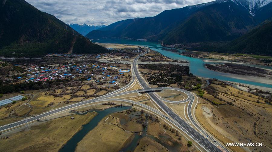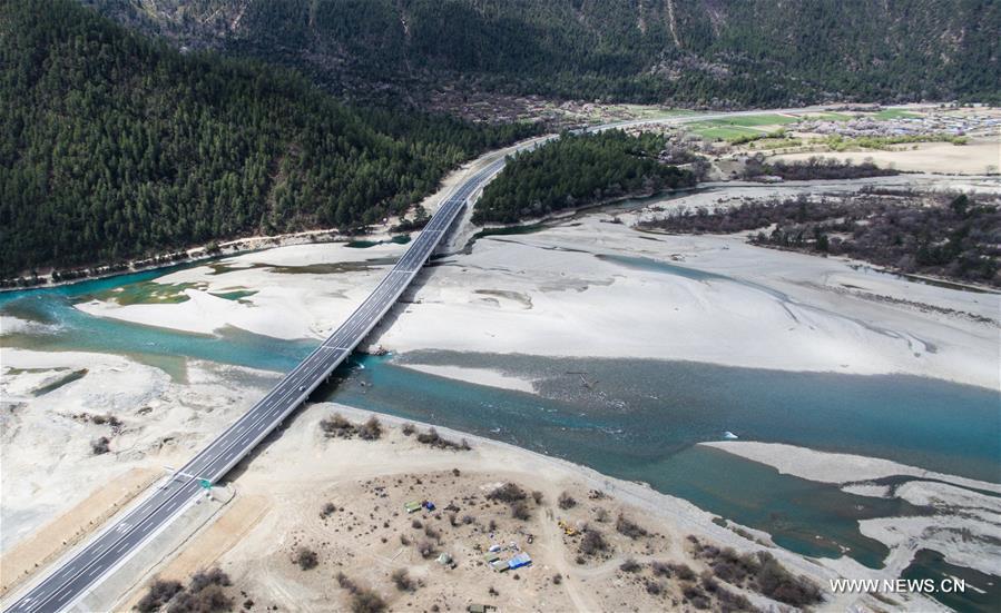 Photo taken on April 4, 2016 shows the scenery of Lhasa-Nyingchi High Grade Highway in Nyingchi City, southwest China's Tibet Autonomous Region. The Lhasa-Nyingchi High Grade Highway, which starts from Lhasa, capital of southwest China's Tibet Autonomous Region, and ends at Bayi Town of Nyingchi City, has a length of 409.2 kilometers. (Photo: Xinhua/Purbu Zhaxi)