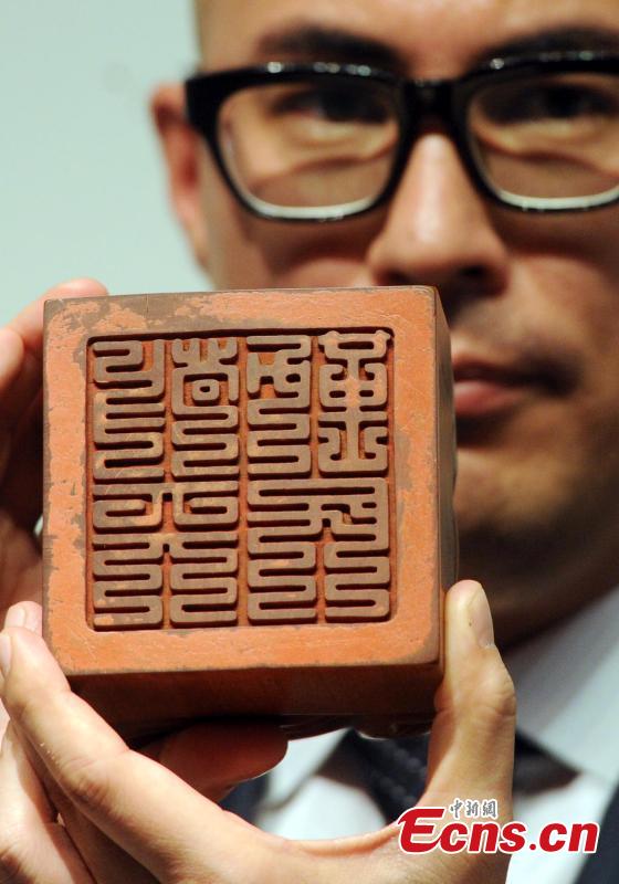 An imperial seal of Qing dynasty Emperor Kangxi has been sold for HK$92 million at an auction in Hong Kong on April 6, 2016. At a Sotheby’s sale at the Hong Kong Convention and Exhibition Centre, the Seal of the Mandate of Heaven was snapped up after just a few minutes of fierce bidding. The seal was an important object of authority for Emperor Kangxi, who ruled over China from 1661 to 1722. Made of sandalwood, it bears the inscription “revere heaven and serve thy people”. Bidding started at HK$15 million. The final fee, including buyer’s premium, was HK$92.6 million. (Photo: China News Service/ Tan Daming)