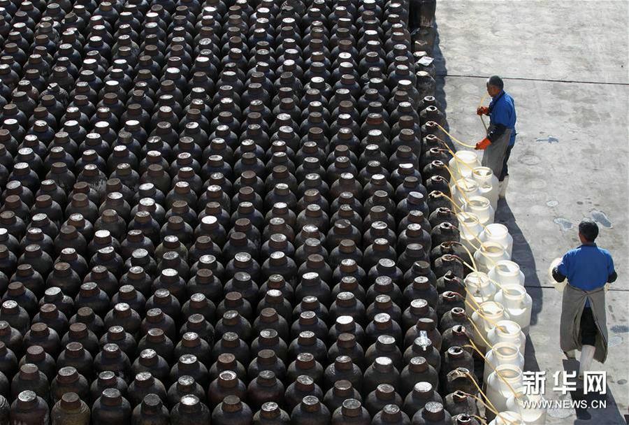 A worker makes Baipu yellow rice wine in a factory, April 4, 2016. (Photo/Xinhua)