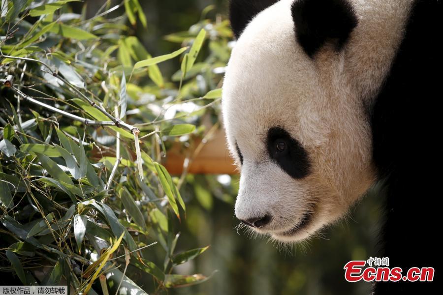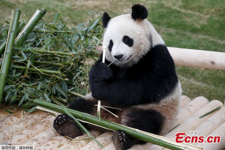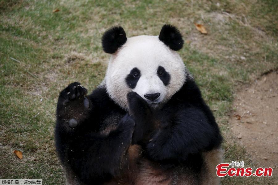 A giant panda plays at the theme park Everland in Yongin, Gyeonggi-do Province, South Korea, April 7, 2016. A pair of giant pandas Aibao (lovely treasure), a two-year-old female, and Lebao (pleasant treasure) a three-year-old male, are in South Korea on a 15-year lease from China. Joint research will be conducted by Everland and China Conservation and Research Center for the Giant Panda. The pandas will be open to the public on April 8. (Photo provided to China News Service)