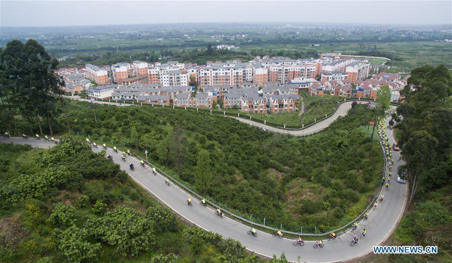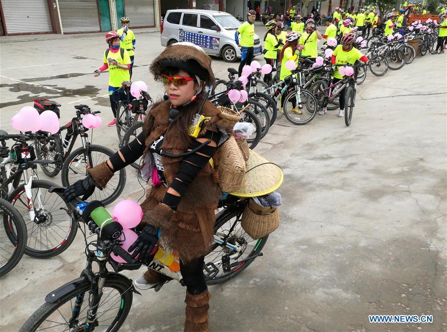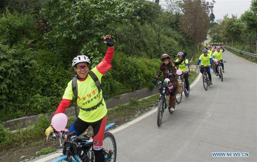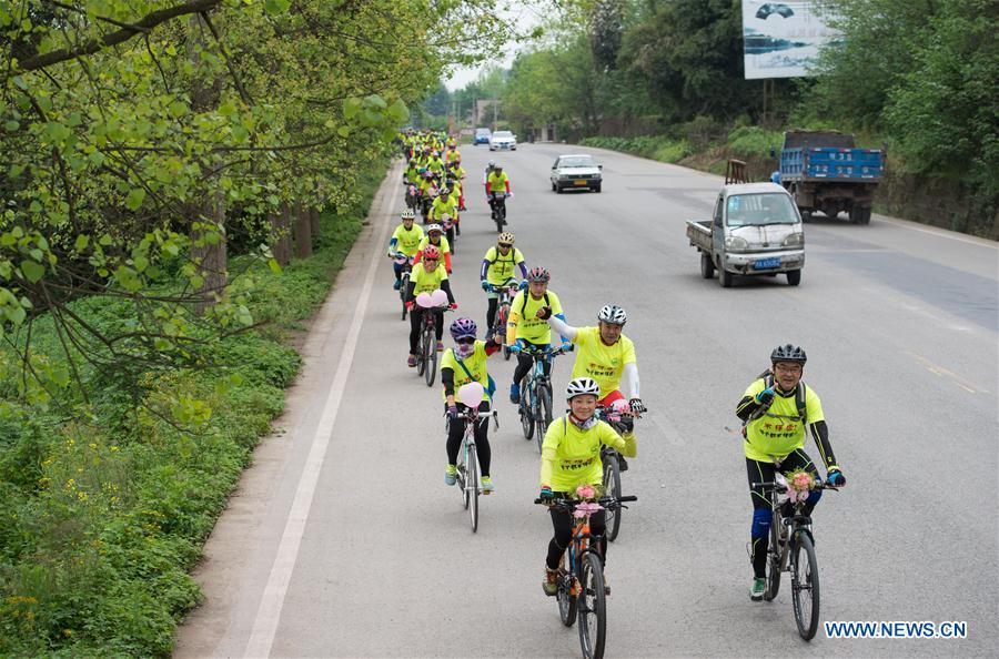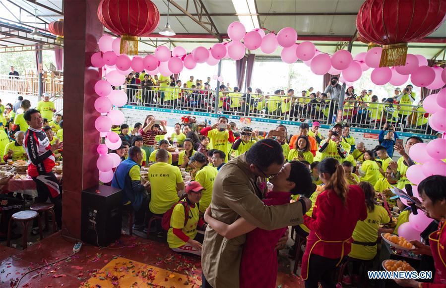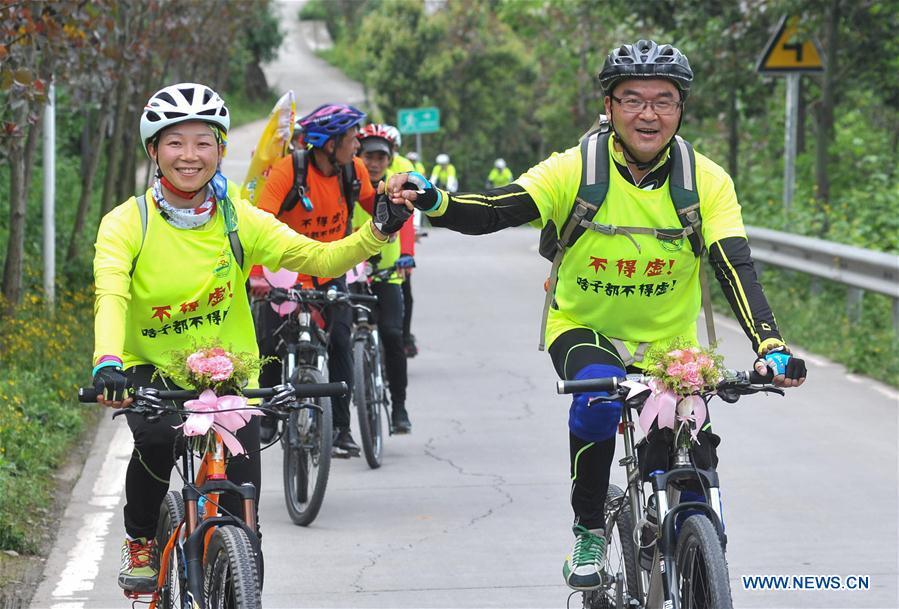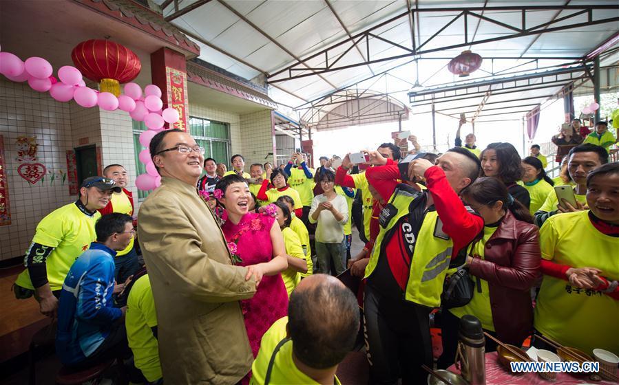 Bridegroom Zeng Di (R, front) and bride Wang Lixia (L, front) ride during their wedding in Chengdu, capital of southwest China's Sichuan Province, April 9, 2016. Sharing the joy of the couple, more than 300 riders celebrated the wedding of riding fans Zeng Di and Wang Lixia in Chengdu on Saturday. The wedding fleet, all bicycles, traveled 4 hours from Chengdu to the bride's home and covered more than 70 kilometers. (Photo: Xinhua/Jiang Hongjing)