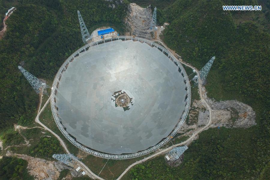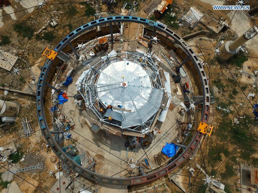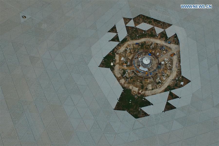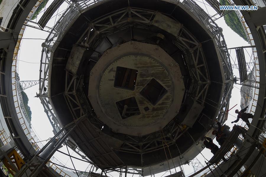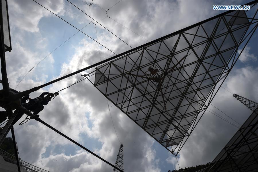 Workers install reflector pannels for the single-aperture spherical telescope "FAST" in Pingtang County, southwest China's Guizhou Province, April 10, 2016. A total of 4,185 reflector panels, an equilateral triangle with a side length of 11 meters each, have been installed on the frame, indicating 94.04 percent of the installation work has been completed. The 500-meter aperture spherical telescope (FAST), to be completed within 2016, is expected to be the world's largest, overtaking Puerto Rico's Arecibo Observatory, which is 300 meters in diameter. (Photo: Xinhua/Ou Dongqu)