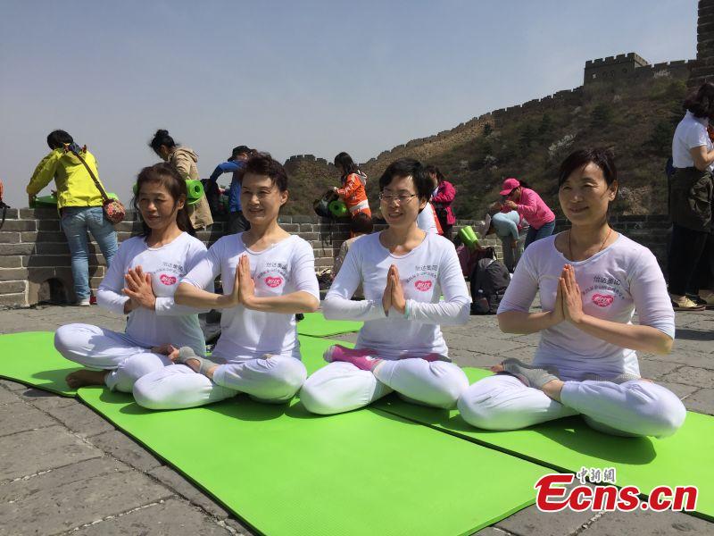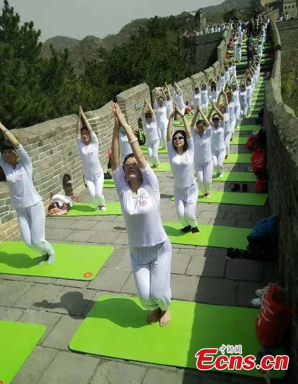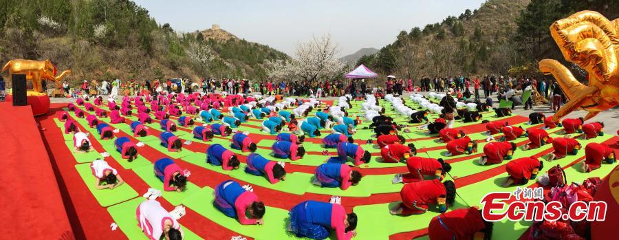 One thousand yoga practicers perform on the Jinshanling section of the Great Wall in Luanping County, North China’s Hebei Province, April 10, 2016. The grand yoga show is part of activities for the ongoing apricot flower festival. Jinshanling is known as the best place for photographers to take pictures of the Great Wall. (Photo: China News Service/Zhang Fan)