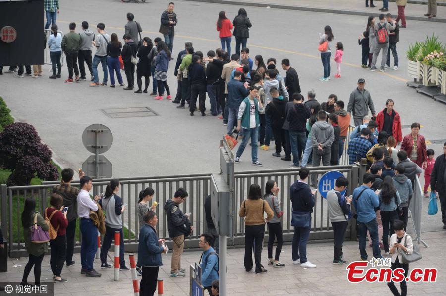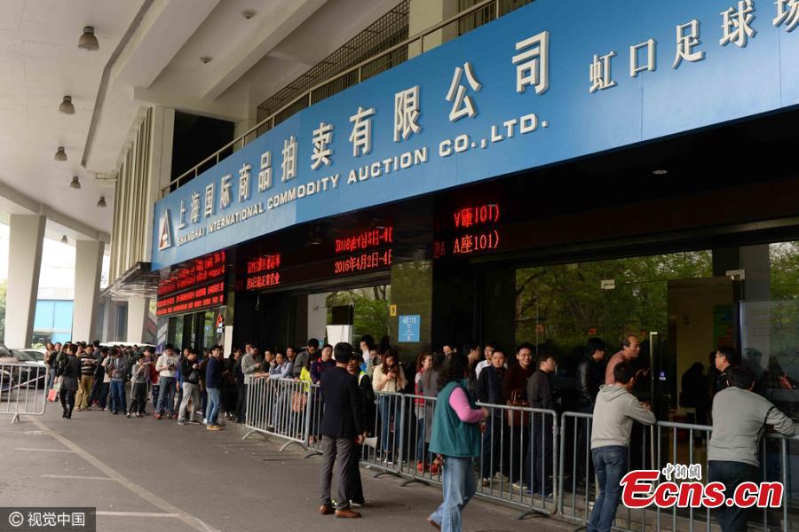 Applicants queue to purchase the bidding report for vehicle license plate auctions in Shanghai, April 10, 2016. Shanghai has increased control of cars running in the city that have license plates issued by other regions. This policy change is driving many residents to compete in Shanghai’s license plate auctions. The price of new license plates in Shanghai has been increasing year by year, with the average bid for a plate at 83,148 yuan ($12,800) and the success rate at 3.8 percent in March. (Photo/CFP)