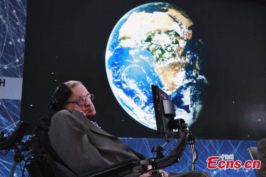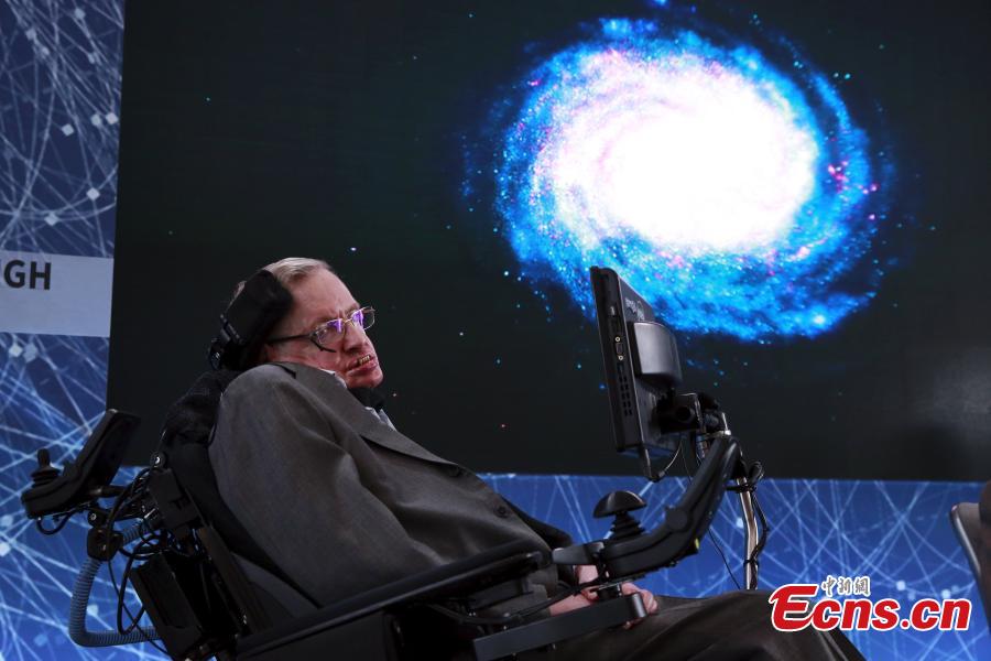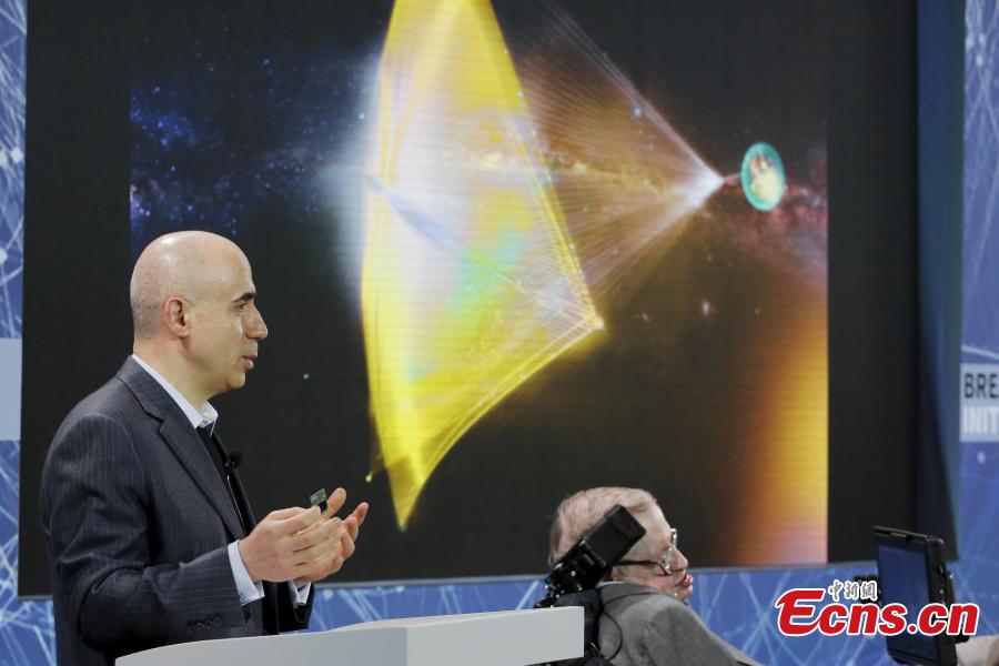 British astrophysicist Stephen Hawking speaks at the "Breakthrough StarShot" project press conference at One World Observatory in New York, the United States, April 12, 2016. Stephen Hawking has teamed up with Russian billionaire Yuri Milner and Mark Zuckerberg to launch the most ambitious alien-hunting mission in history. The $100m project, called Breakthrough Starshot, will rely on tiny so-called 'nanocraft' flying on sails pushed by beams of light through the universe. They will travel to the Alpha Centauri star system 25 trillion miles (4.37 light years) away on a twenty-year mission to look for alien life. (Photo provided to China News Service)