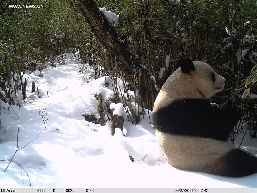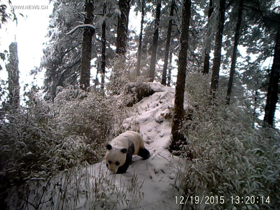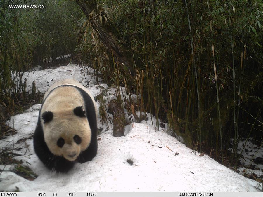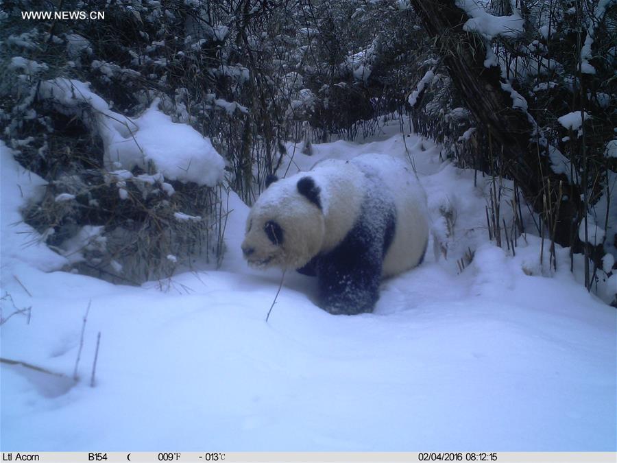 Photo taken with an infrared camera shows a wild giant panda in a forest in Tielou Township of Longnan City, northwest China's Gansu Province, Feb. 4, 2016. Over 160 infrared cameras were placed by forest authorities to monitor the wild animals and plants in the national nature reserve of Baishui River, with 110 giant pandas living in. (Photo/Xinhua)