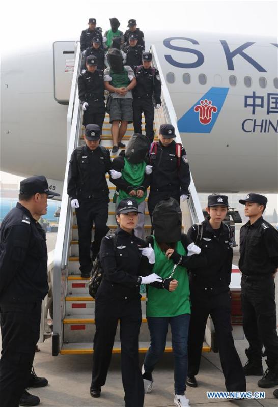Chinese telecom fraud suspects deported from Kenya get off a plane after arriving at the Beijing Capital International Airport in Beijing, capital of China, April 13, 2016. Kenyan police deported 77 Chinese telecom fraud suspects, including 45 Taiwanese, to the Chinese mainland. The first group of 10 people had been repatriated on Saturday and the remaining 67 were sent back by a chartered plane on Wednesday. (Photo: Xinhua/Yin Gang)