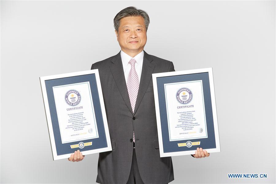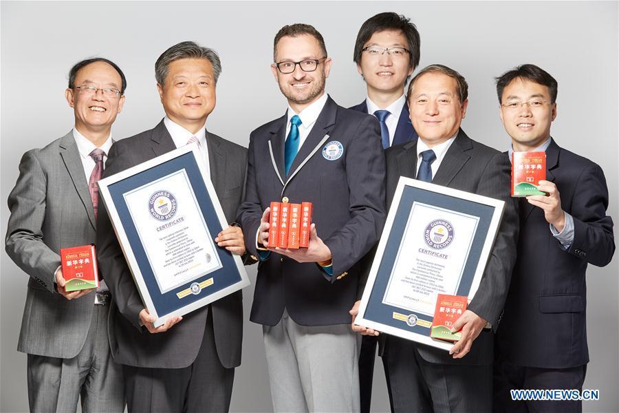 Guinness World Records Senior Vice President Marco Frigatti (C), President of China Publishing Group Tan Yue (L) and President of The Commercial Press of China Yu Dianli display two certificates and some copies of Xinhua Dictionary in London, Britain, April 12, 2016. Guinness World Records Tuesday confirmed here that Xinhua Dictionary published by China's The Commercial Press is the "most popular dictionary" and the "best-selling book (regularly updated)." As of July 28, 2015 (last updated date), Xinhua Dictionary, the first modern Chinese dictionary since the foundation of the People's Republic of China on Oct. 1, 1949, has sold 567 million copies globally, Guinness World Records announced at the presentation ceremony in London. (Xinhua/Guinness World Records)