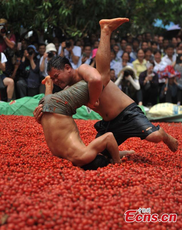 Two villagers wrestle against each other in a pool filled with cherry tomatoes in Tianyang county, South China's Guangxi Zhuang autonomous region, April 14, 2016. Local people held such an activity in a pool which was filled with cracked and redundant cherry tomatoes to celebrate tomato harvest. (Photo: China News Service/ Jiang Xuelin)