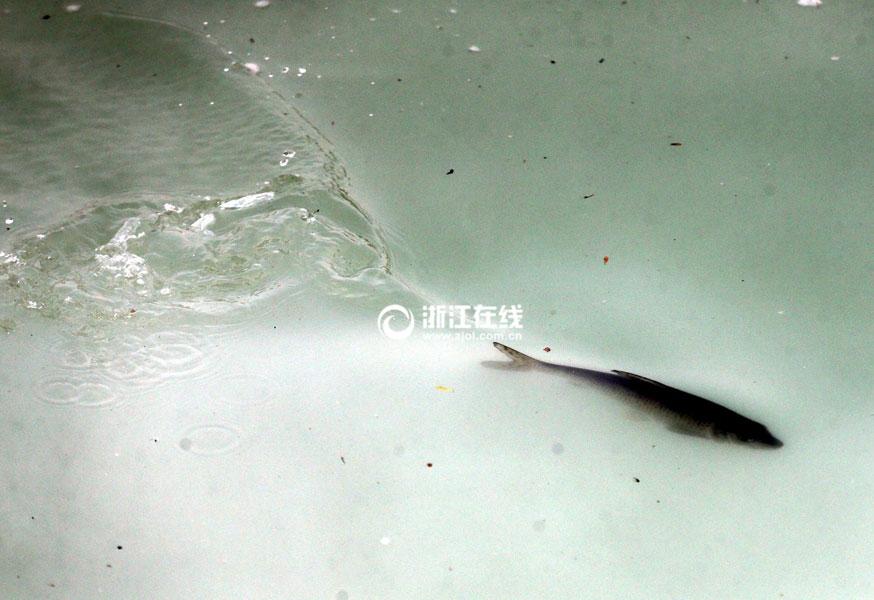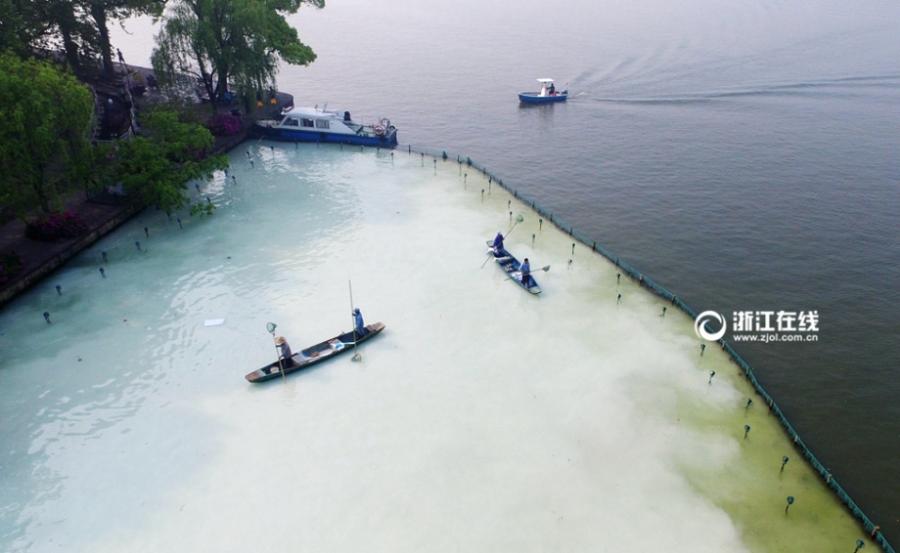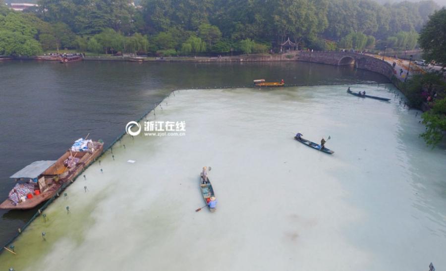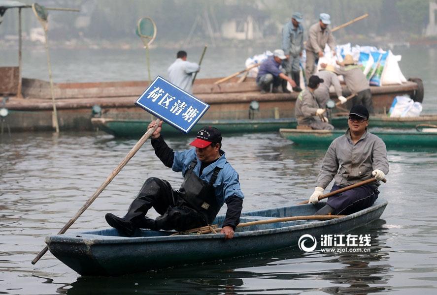 Workers from the water and environmental management are busy sprinkling chlorine powder into the water near the Xiling Bridge in West Lake in east China's Zhejiang province on April 14, 2016. As temperatures go up in spring, the lotus begins to shoot forth. However, grass carps, bream fish and crucian carps prefer eating sprouts. So the staff uses the chlorine powder to get rid of the moss and small fish. (Photo/zjol.com.cn)