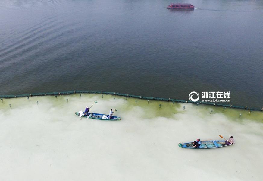Workers 'bleach' West Lake in Hangzhou(1/9)