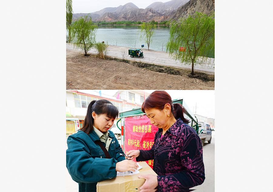 (Top) Wang Yuming, an e-shop owner, carries packages to a delivery car in Guanzhuang, a village in Zaozhuang city, East China's Shandong province, April 13, 2016. (Below) Wang Yuming's wife checks delivery information at home in the village, April 13, 2016. Wang and his wife started a business online to sell agricultural products in 2010. Now, their daily turnover is 10,000 yuan ($1,542). (Photo/Xinhua)