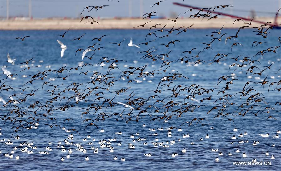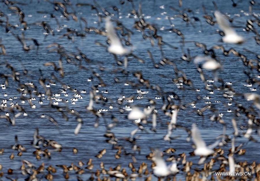 Migrant birds fly above wetland along seaside off Qinhuangdao, north China's Hebei Province, April 14, 2016. Qinhuangdao has enforced the protection of wetland along seaside in recent years, and tens of thousands of migrant birds fly past here during migration every year. (Xinhua/Yang Shiyao)