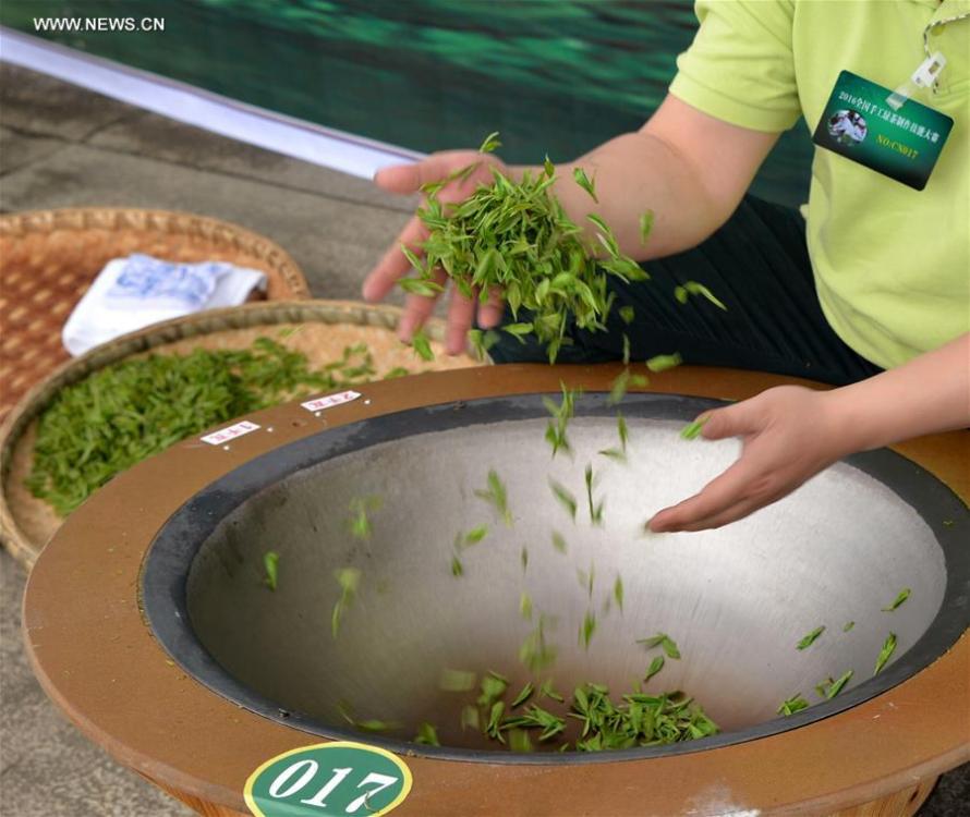 A contestant takes part in a competition of handmade green tea producing technique during a tea cultural festival in Meitan County of Zunyi City, southwest China's Guizhou Province, April 18, 2016. The four-day tea cultural festival opened here on Monday. (Photo/Xinhua)