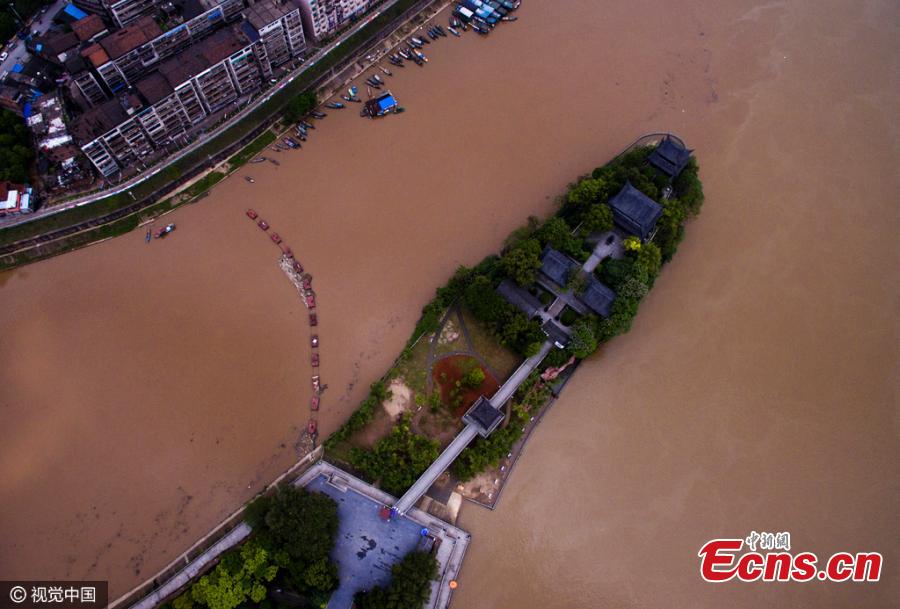 The Shigu Academy is surrounded by muddy flood water in Hengyang City, Central China’s Hunan Province, April 18, 2016. Built in the Tang Dynasty (618-907), the academy is located on Shigu Mountain at the convergences of three rivers and is known as one of the four great academies in ancient China. Local authorities have warned that floods above alarm levels will hit the region again. (Photo/CFP)