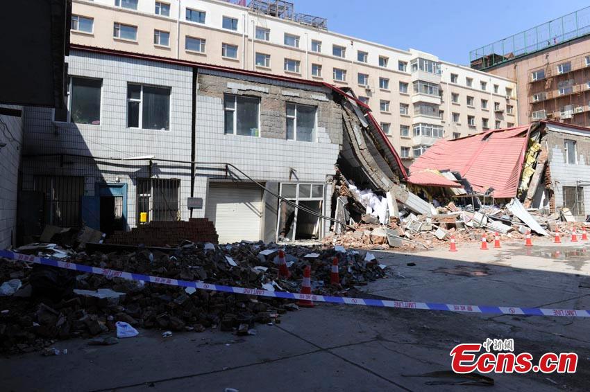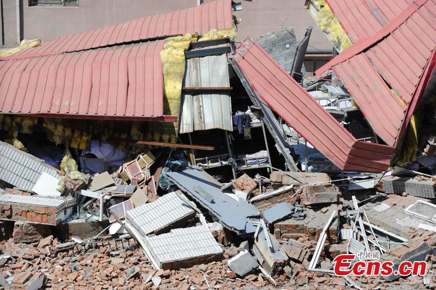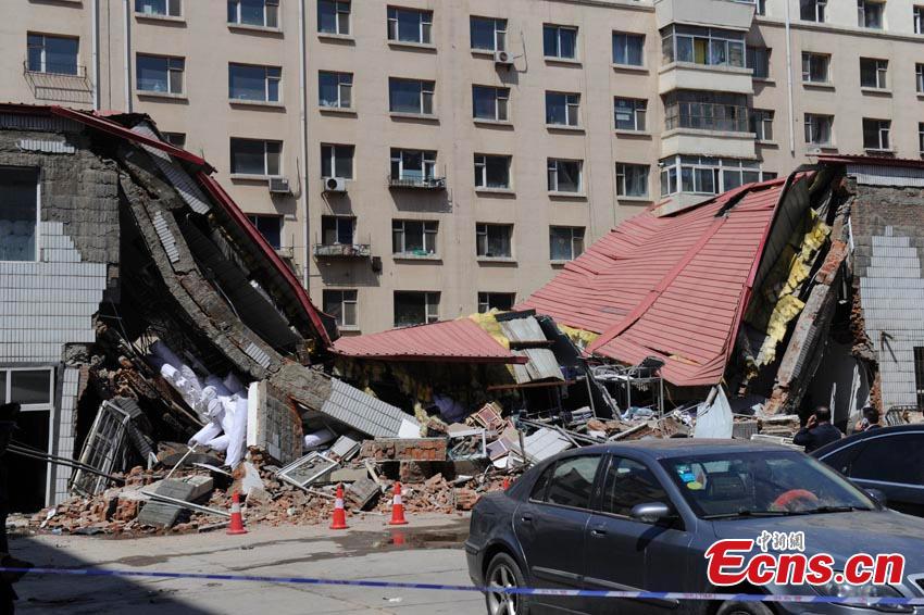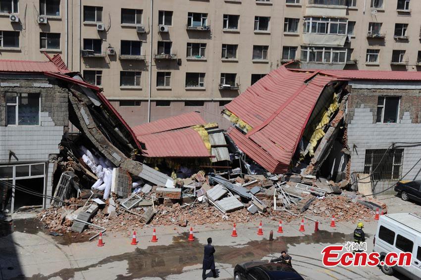 A collapsed two-story building in Changchun city, the capital of Northeast China’s Jilin Province, April 19, 2016. Survivors evacuate from the debris with no report of known casualties as rescue work continues. (Photo: China News Service/Zhang Yao)