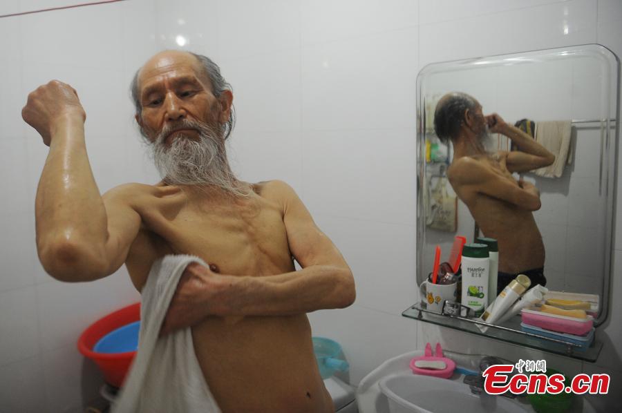 Liu Fuzhong, 72, practices martial arts in Jinzhong City, North China’s Shanxi Province. Liu became interested in martial arts as a child, and learned from master Li Guichang at 21 years old. Liu said he is in good health and rarely gets sick, which he attributes to having practiced the sport for 50 years. Based on Xingyiquan, a type of martial arts known for its explosive power, Liu also created a new style by drawing from strengths of other schools of martial arts. Even at 72, he can perform stunning body movements that can be challenging for young people. Tired of urban life with its poor air quality, he moved from the city to live in a village, surrounded by lush trees, but his wife still mainly lives in the city. Liu said his dream is to visit a primitive land of peace and live for 100 years. (Photo: China News Service/Liu Jiang)