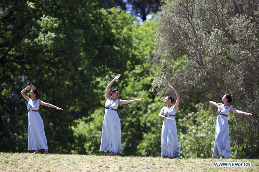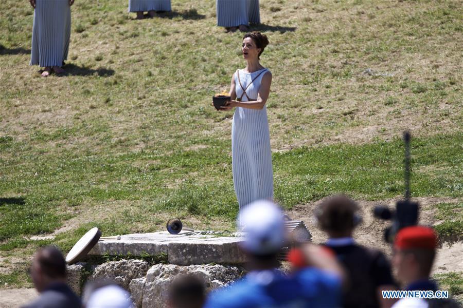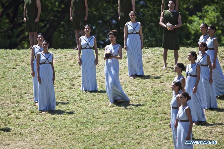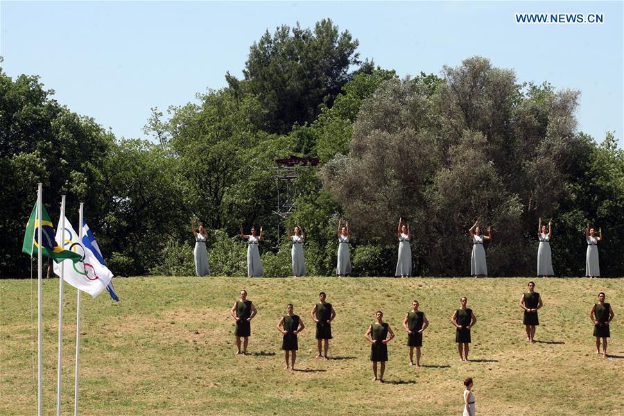 Katerina Lechou (R) acting the high priestess hands an olive branch to Eleftherios Petrounias, Greece's artistic gymnast, during the Olympic flame lighting ceremony for the Rio 2016 Olympic Games inside the ancient Olympic Stadium on the site of ancient Olympia, Greece, April 21, 2016. (Photo: Xinhua/Jin Yu)