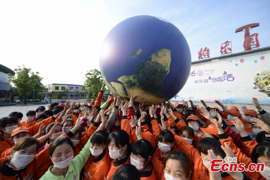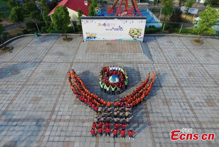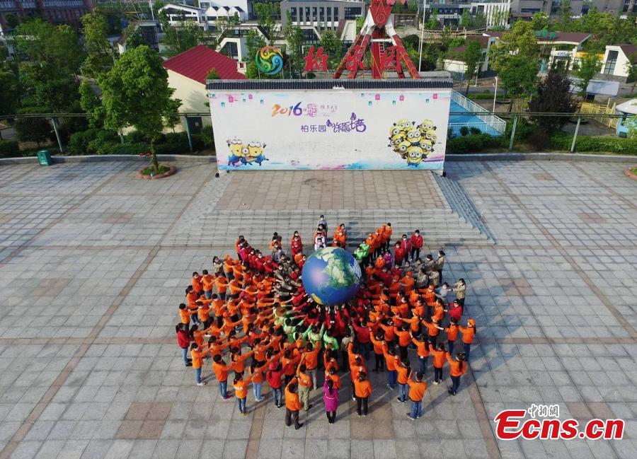 More than 200 employees attend an event to mark Earth Day at a theme park in Changsha City, the capital of Central China’s Hunan Province, April 21, 2016. The employees stood to form the shape of the Earth and called for tourists to support environmental protection. (Photo: China News Service/Yang Huafeng)