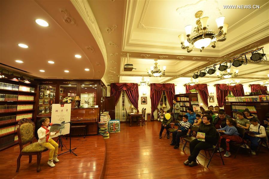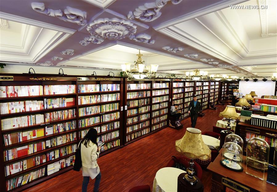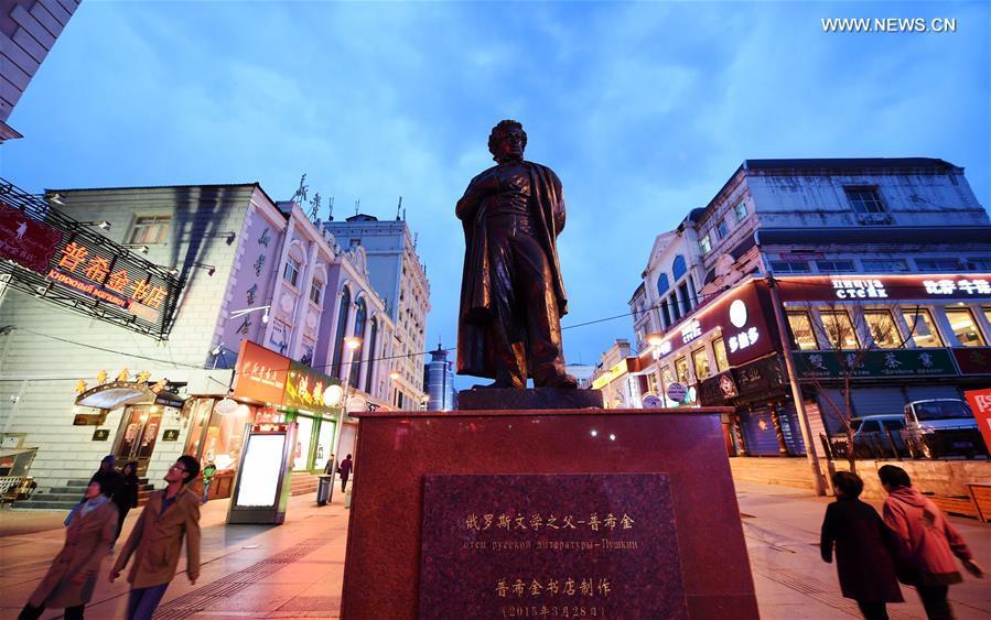 Photo taken on April 19, 2016 shows a sculpture of poet Pushkin outside the Pushkin Bookstore in Harbin, capital of northeast China's Heilongjiang Province. The Pushkin Bookstore decorated with warm light and European bookshelf, holds reading activities every day and attracts many readers. (Photo: Xinhua/Wang Jianwei)